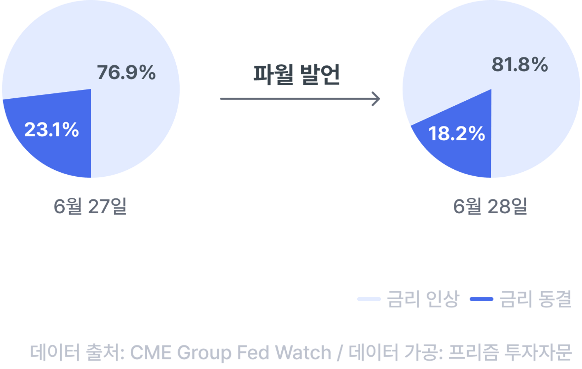 그래서 일까요? ECB 포럼 토론 이후, 시카고상품거래소 FED 워치 시장에서의 7월 금리 인상 가능성은 전날 76.9%에서 81.8%로 상승했네요!