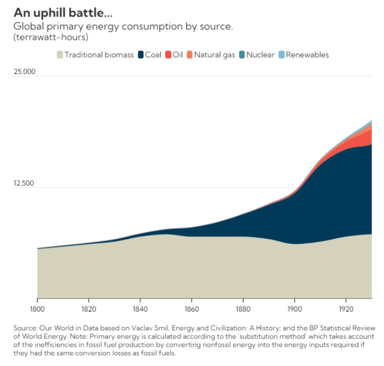 아래의 첫 번째 <그림>은 1800년부터 1930년까지의 세계 에너지 소비 구성을 보여줍니다. 1840년 전후까지는 바이오매스(=목탄 등)가 절대적인 비중을 차지하다, 영국의 산업혁명을 계기로 석탄 소비가 폭발적으로 늘어난 것을 확인할 수 있습니다.