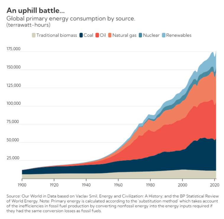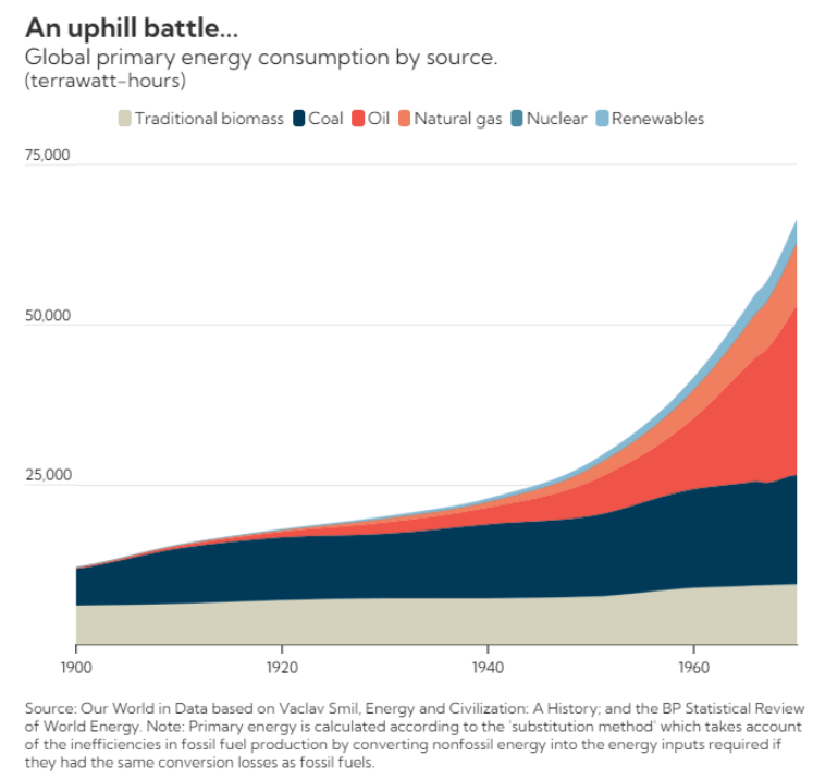 20세기 초반을 지나면서부터 석유의 시대가 열린 것을 발견할 수 있습니다. 이 기세는 1973년 제 1차 석유위기가 발생할 때까지 이어졌죠. 물론 석탄의 시대가 완전히 사라진 것은 아니었습니다. 석탄의 소비량은 꾸준한 증가세를 지속하며 주요 에너지 원 중에서 2위의 자리를 지켰죠.