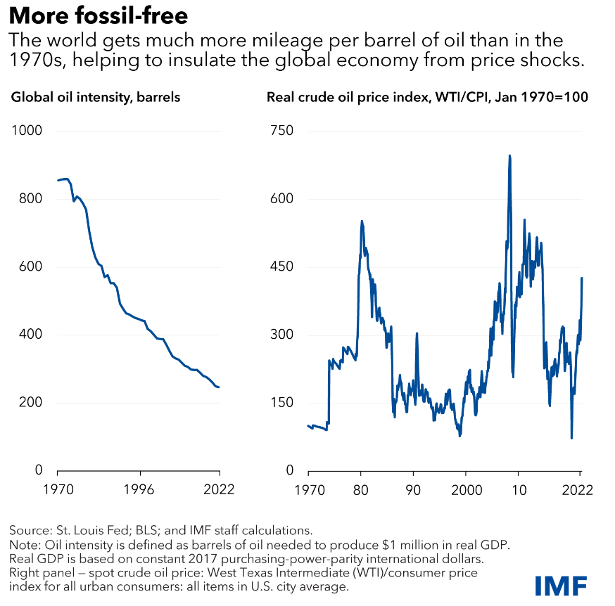 그러나 최근 국제통화기금(IMF)가 제공한 아래의 <그림>은 이 공포가 너무 과장되었음을 시사합니다. <그림>의 왼쪽 부분은 에너지 집약도를 나타내는데, 간단하게 말해 1백만 달러에 이르는 경제성장에 필요한 원유의 양을 측정한 것입니다. 1970년대에만 해도 900배럴이 필요했다면, 최근에는 200배럴 밑으로 내려가는 중이죠. 즉, 세계는 이전에 비해 훨씬 에너지를 효율적으로 사용하는 중입니다.