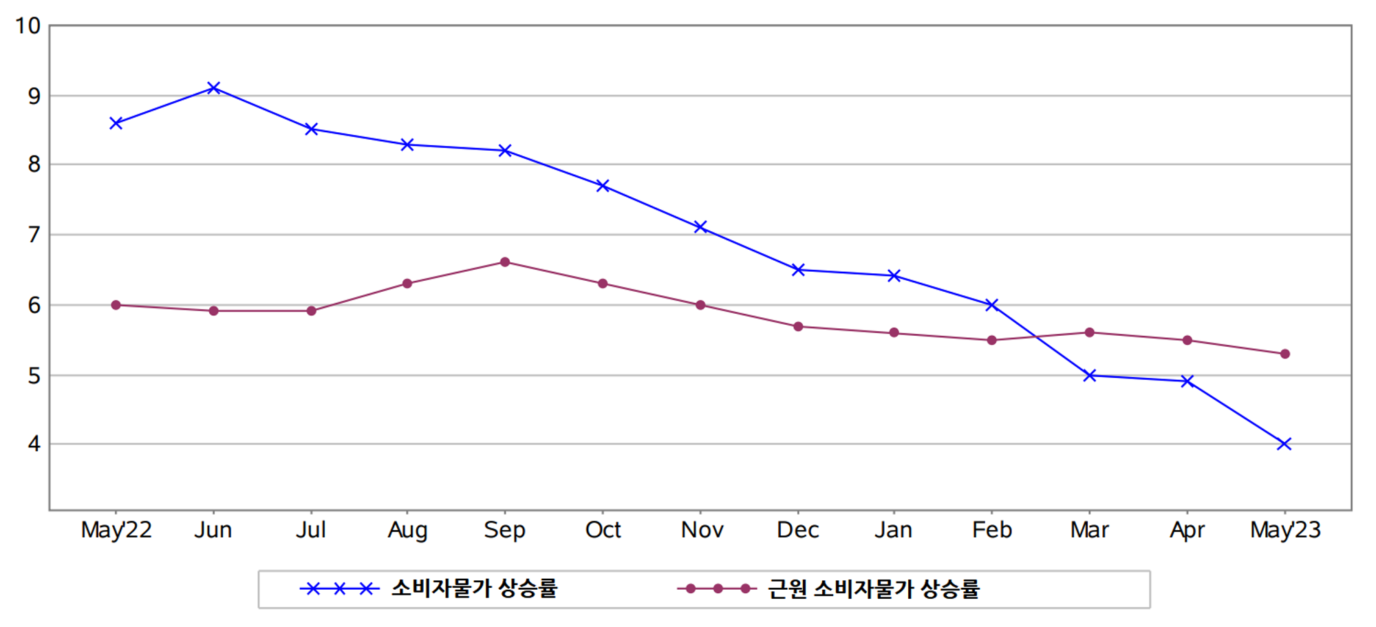 2023년 5월 미국 소비자물가는 전월에 비해 0.1%, 전년 같은 기간에 비해 4.0% 상승에 그쳤습니다. 인플레 압력이 약화된 가장 직접적인 이유는 국제 유가 및 식료품 가격의 하향 안정 때문이었죠. 그러나 에너지와 식료품을 제외한 근원 인플레는 전월에 비해 0.4%, 전년 동기에 비해 5.3% 오르는 등 불안한 모습을 보였습니다. 다만 근원 인플레 급등의 원인으로 지목되는 중고차 값은 다음 달부터 안정될 가능성이 높다는 점이 위안거리입니다. 따라서 미국 소비자물가는 연내 3% 전후까지 떨어질 것이라는 전망을 유지합니다 .