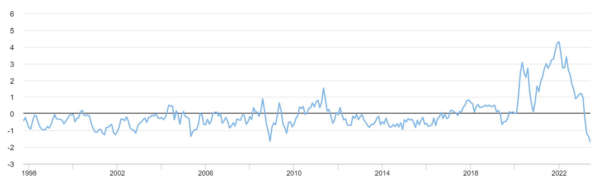 더 나아가 공급 사슬망의 불안도 해소되고 있습니다. <그림 5>은 뉴욕 연은에서 발표하는 공급 사슬망 압력 지수(GSCPI) 흐름을 보여주고 있는데, 최근 역사상 최저 수준으로 떨어진 것을 발견할 수 있습니다.