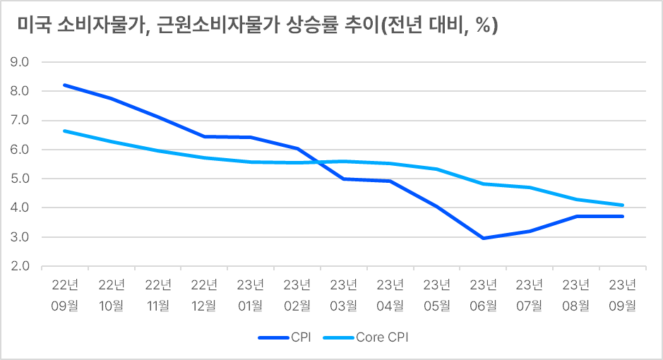 - 최근 미국 노동부가 발표한 2023년 9월 미국 소비자물가는 전월에 비해 0.4% 그리고 전년 같은 기간에 비해 3.7% 상승해 시장 참가자들의 예상을 상회했습니다.
