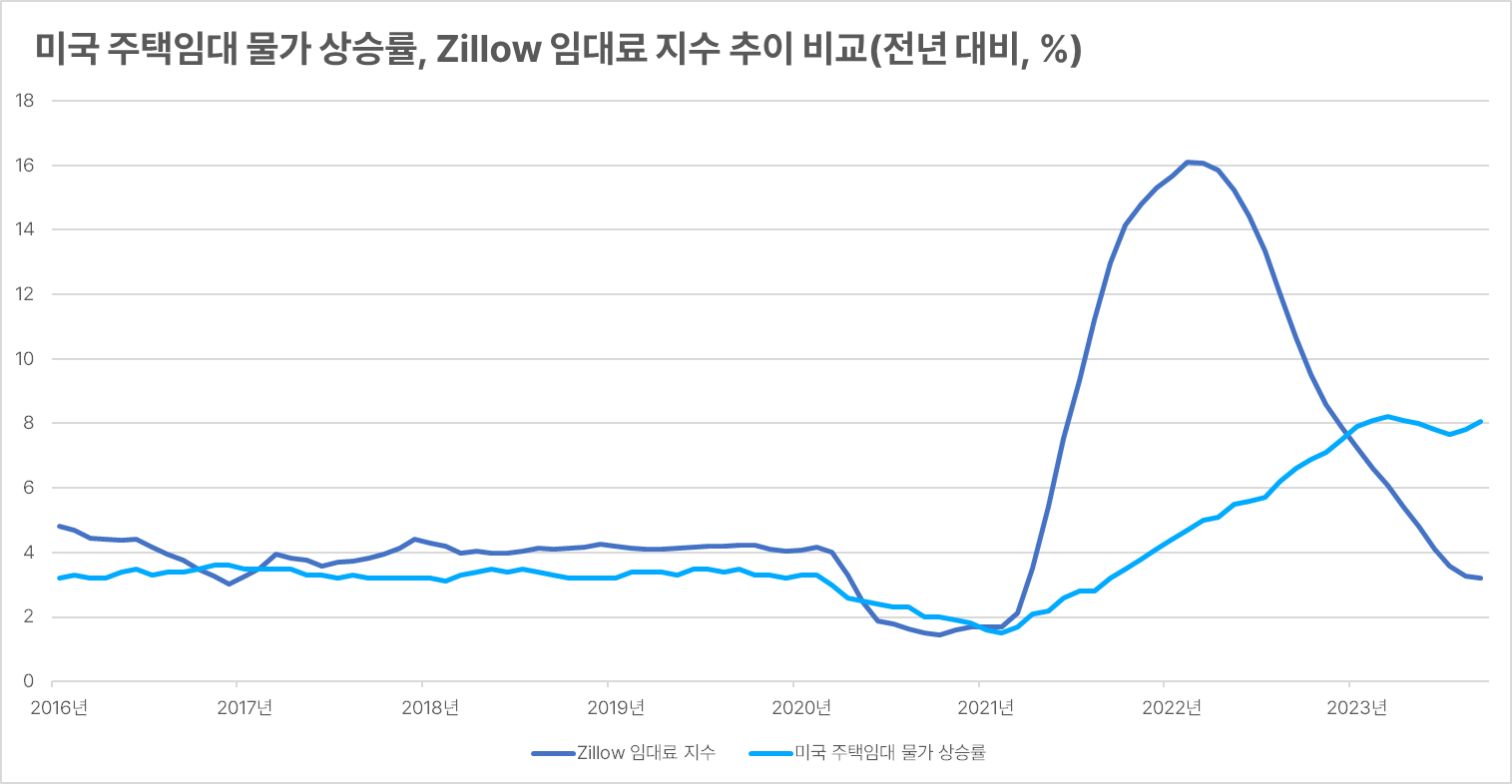 전체 물가에서 가장 큰 비중을 차지하는 집세 물가가 전월에 비해 0.6% 상승하는 등 다시 불안정한 모습을 보이고 있습니다. 미국 최대의 프롭테크 회사, 질로우(Zillow)에서 발표하는 임대료 가격 지수는 안정을 되찾고 있지만, 주택가격(Owners' equivalent rent of residences) 항목이 다시 불안정한 모습을 보이고 있기 때문으로 보입니다.
