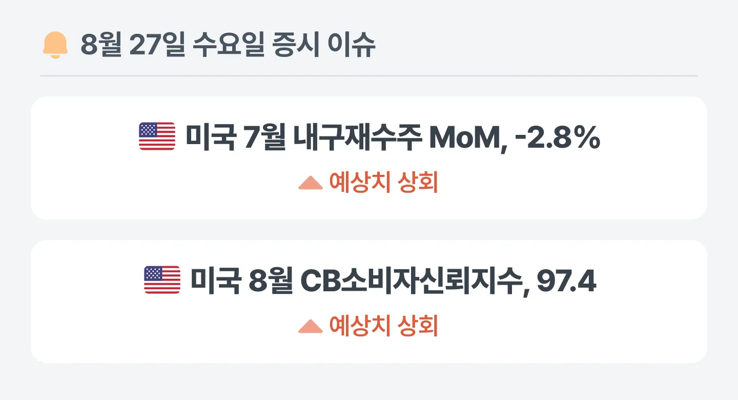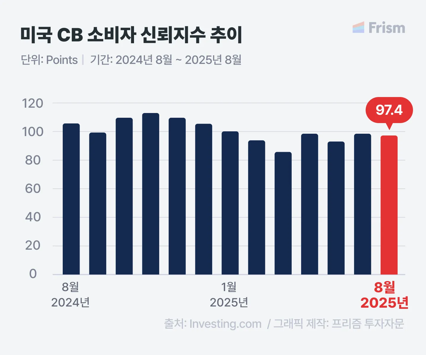๋ฏธ๊ตญ 8์ CB์๋น์์ ๋ขฐ์ง์๋ 97.4๋ก ์ ์(98.7)์ ๋นํด์๋ ํ๋ฝํ์ง๋ง ์์์น(96.4)๋ฅผ ์ํํ์ด์.