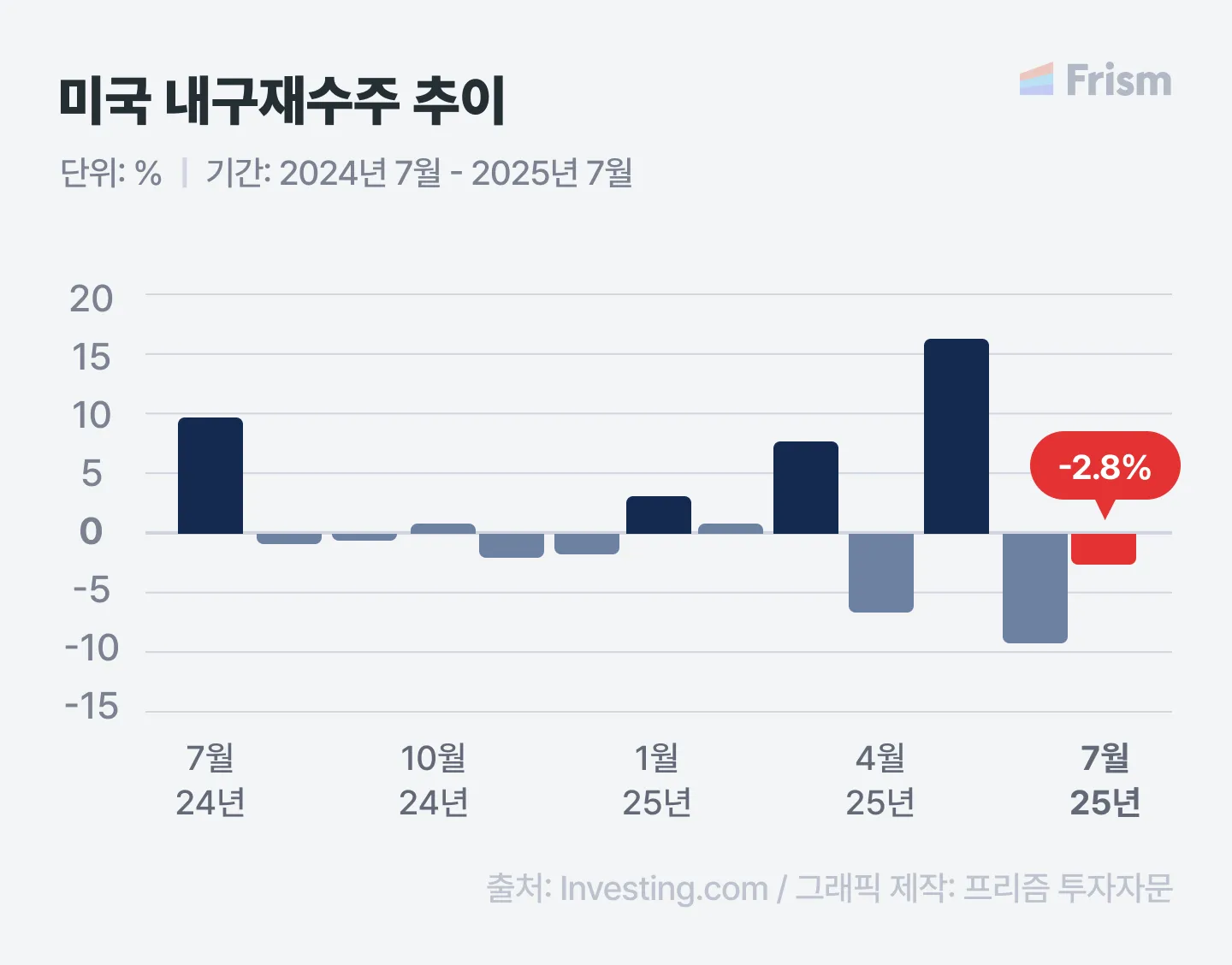 26์ผ ๋ฐํ๋ ๋ฏธ๊ตญ 7์ ๋ด๊ตฌ์ฌ์์ฃผ๋ ์ ์ ๋๋น -2.8% ๊ฐ์ํ์ง๋ง ์์์น(-3.8% ๊ฐ์)์ ๋นํด ๋์ ๊ฒฐ๊ณผ๋ฅผ ๋ณด์์ด์.