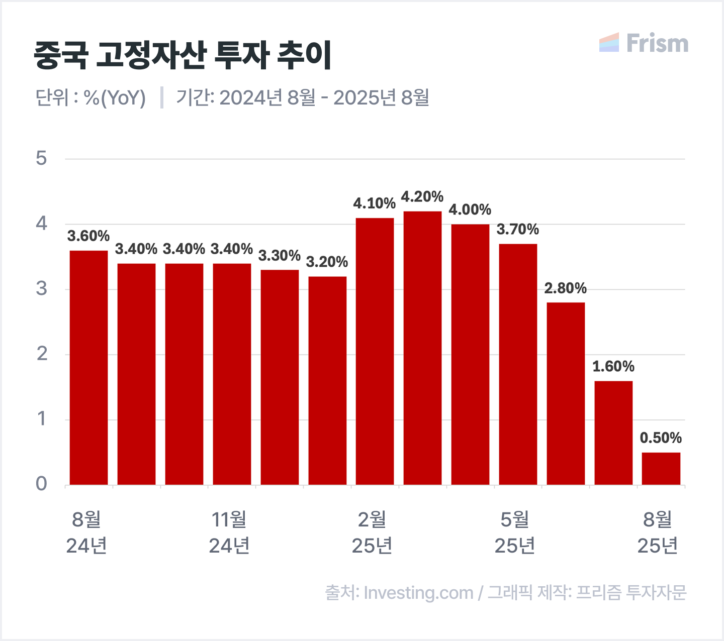 ์ค๊ตญ 1~8์ ๋์ ๊ณ ์ ์์ฐ ํฌ์, YoY 0.5%(์์์น ํํ)