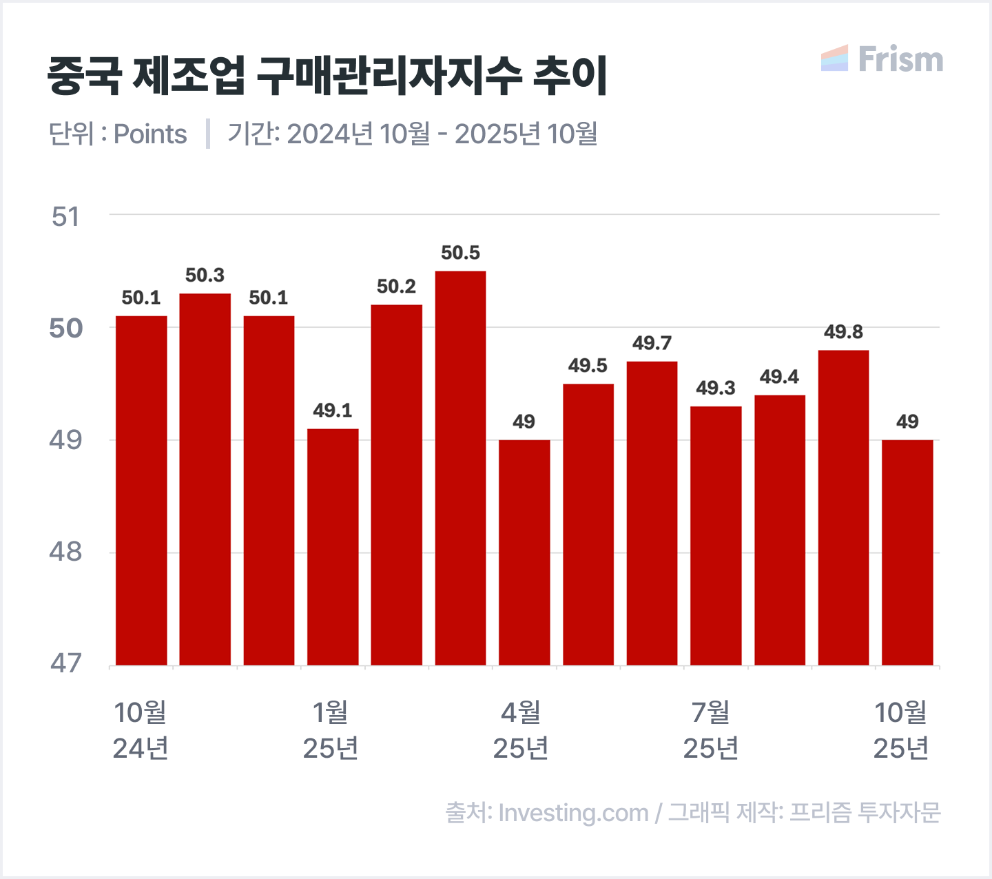 31μΌ λ°νλ μ€κ΅ 10μ μ μ‘°μ ꡬ맀κ΄λ¦¬μμ§μλ 49.0μΌλ‘ μ μ(49.8) λ° μμμΉ(49.6)λ₯Ό λͺ¨λ νννμ΄μ.