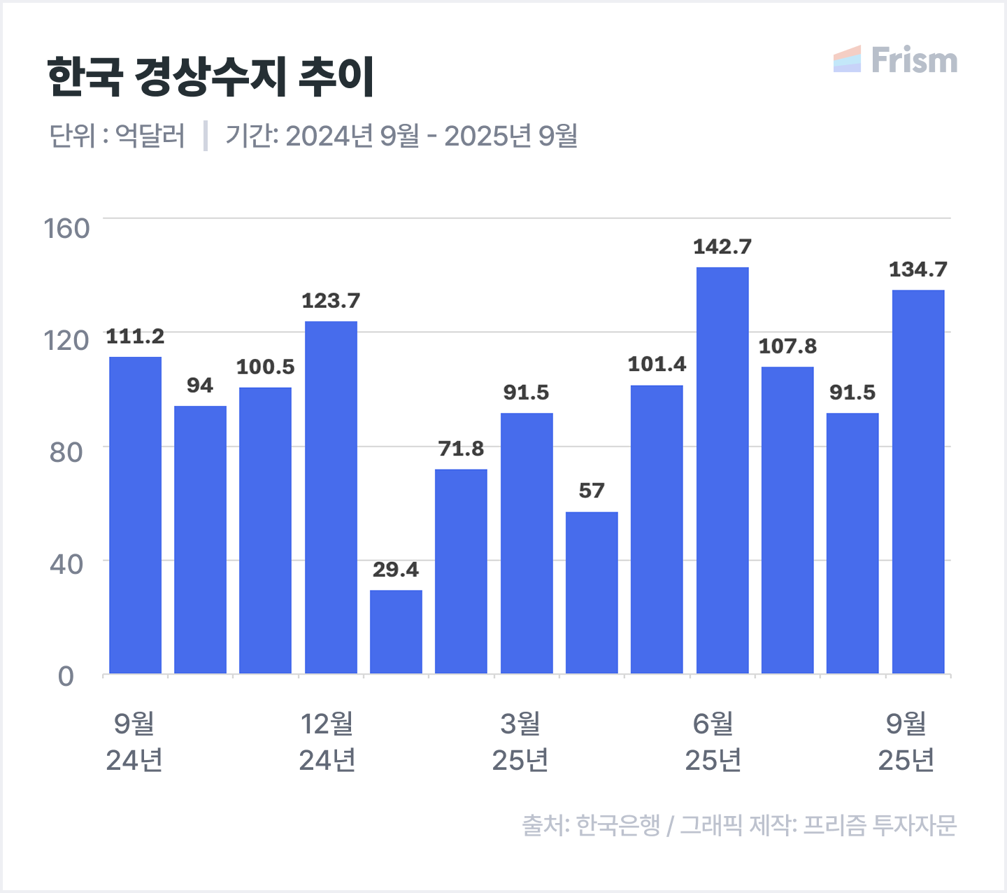 6μΌ λ°νλ νκ΅μ 9μ κ²½μμμ§λ 134μ΅7,000λ§ λ¬λ¬ νμλ‘ μ μ(91μ΅5μ²λ§ λ¬λ¬) λλΉ μμΉνμ΄μ.