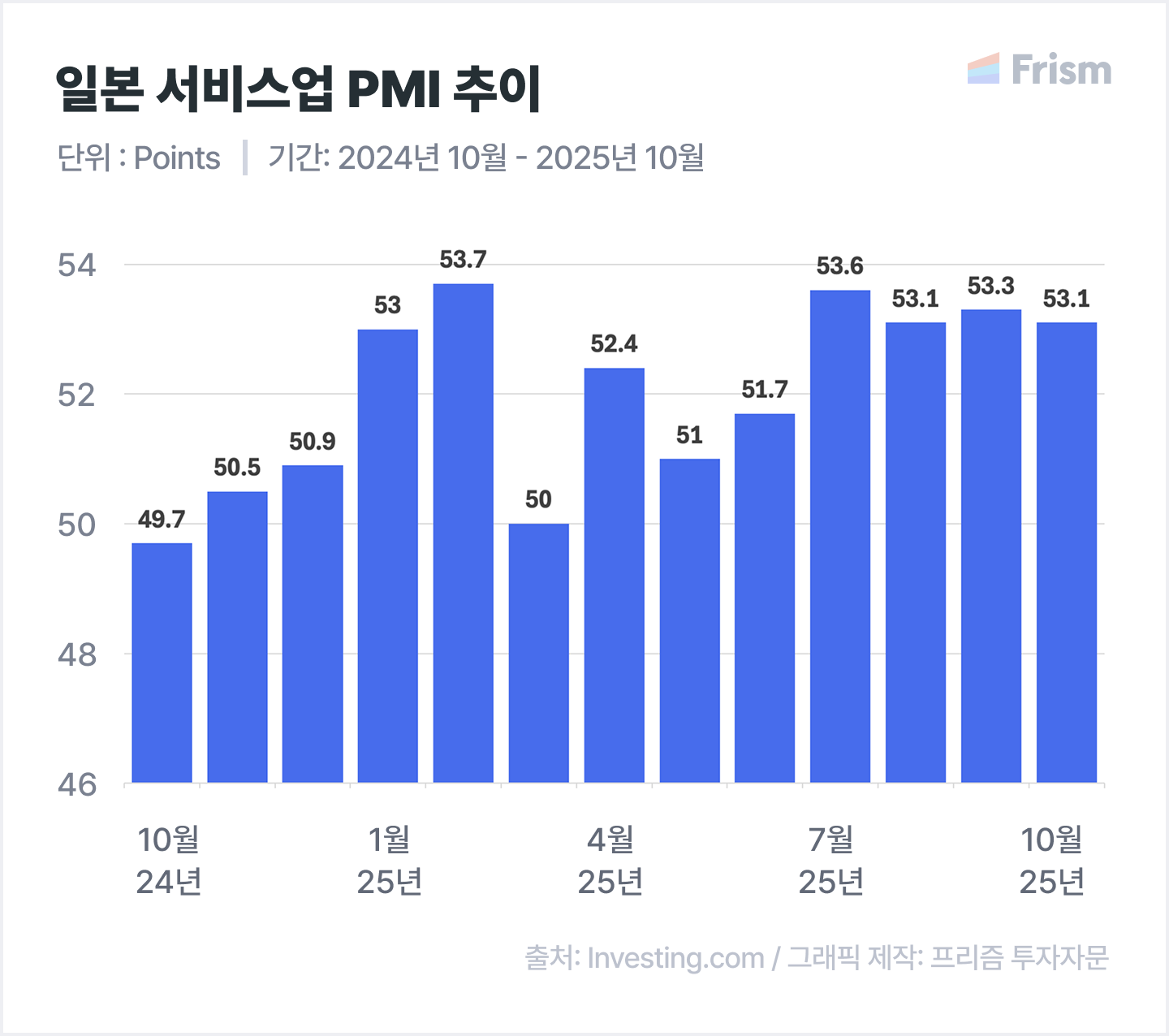 6μΌ λ°νλ μΌλ³Έμ 10μ μλΉμ€μ ꡬ맀κ΄λ¦¬μμ§μ(PMI)λ 53.1λ‘ μ μ(53.3)λλΉ νλ½νμ§λ§ μμμΉ(52.4)λ₯Ό μννμ΄μ.