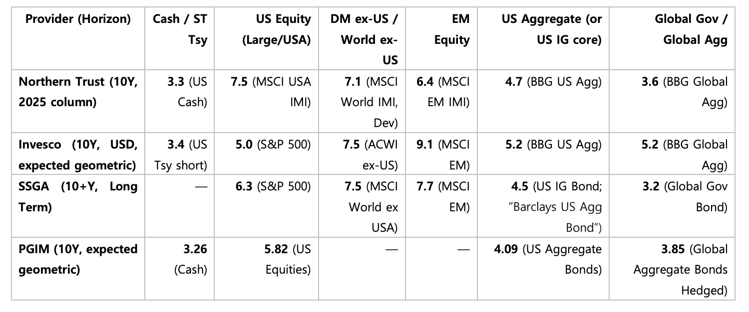 글로벌 금융사들은 미국 대형주(US Equity)의 향후 10년 기대수익률을 연 5~7% 수준으로 보수적으로 잡고 있습니다.