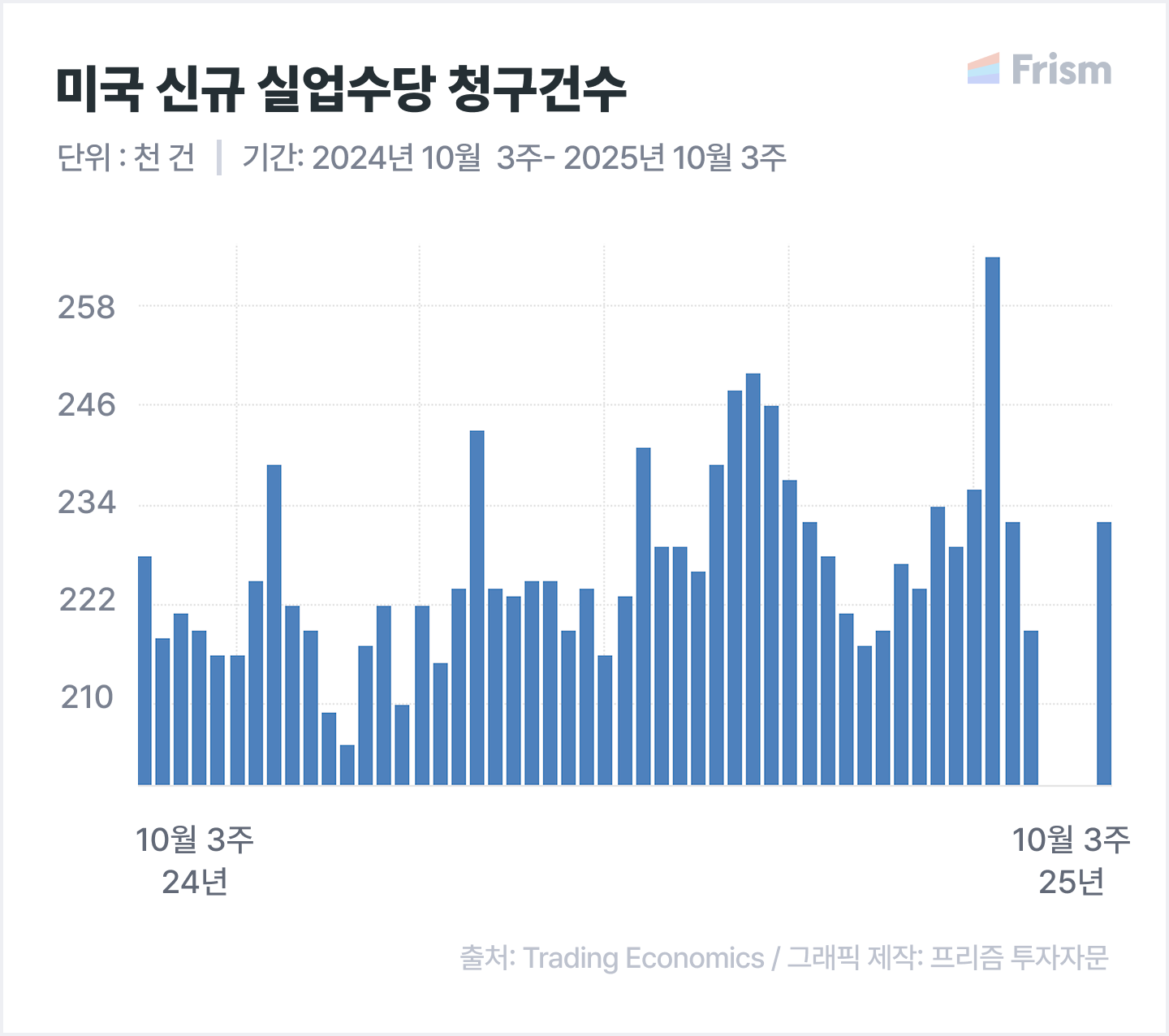 미 노동부는 셧다운 사태 여파로 9월 25일 발표를 끝으로 최근까지 실업수당 청구 통계를 발표하지 않다가 사전 공지나 부연 설명 없이 10월 12∼18일분 통계만 홈페이지에 업데이트했어요. 1주간에 해당하는 단편적인 자료이긴 하지만 이번에 업데이트된 통계는 10월 중순까지 큰 해고 없이 미국의 실업률이 안정된 상황을 유지했을 가능성을 보여준다고 해요.