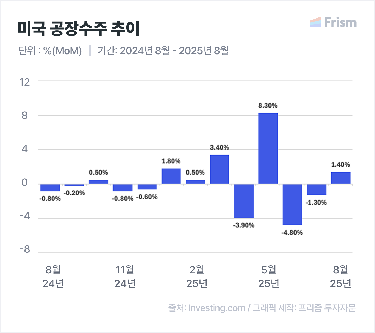 셧다운 이후 발표된 미국 8월 공장수주는 전월 대비 1.4%, 전년 대비 3.3% 증가하며 예상치에 부합했어요.