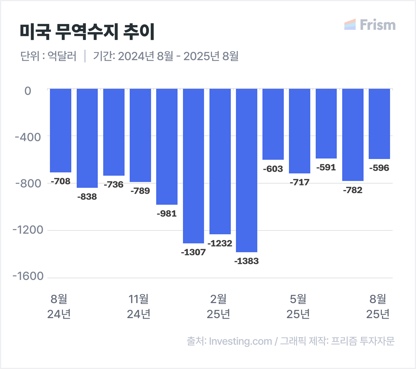 미국 8월 무역수지는 596억 달러 적자를 기록했지만 적자폭은 전월 대비 23.8% 감소하며 전예상치(613억달러 적자)를 상회했어요.