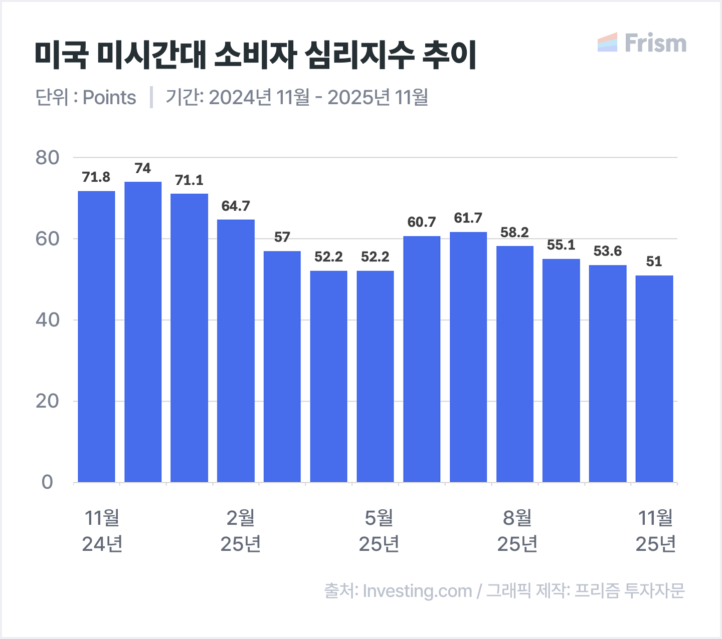 미시간대학이 발표한 11월 소비자심리지수(확정치)는 51.0로 예비치(50.3)는 상회했지만, 2022년 6월 이후 최저치를 기록했어요.