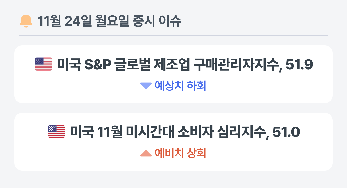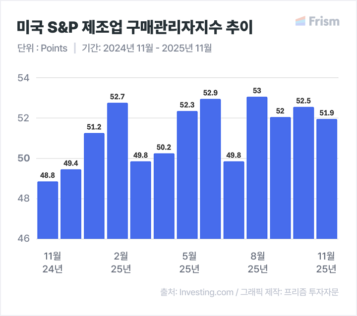S&P 글로벌이 발표한 미국 11월 제조업 PMI 속보치는 51.9로 전월(52.5) 대비 하락하며 예상치(52.0)를 하회했어요. 다만 기준선(50) 위를 유지하며 확장 국면은 지속됐어요.
