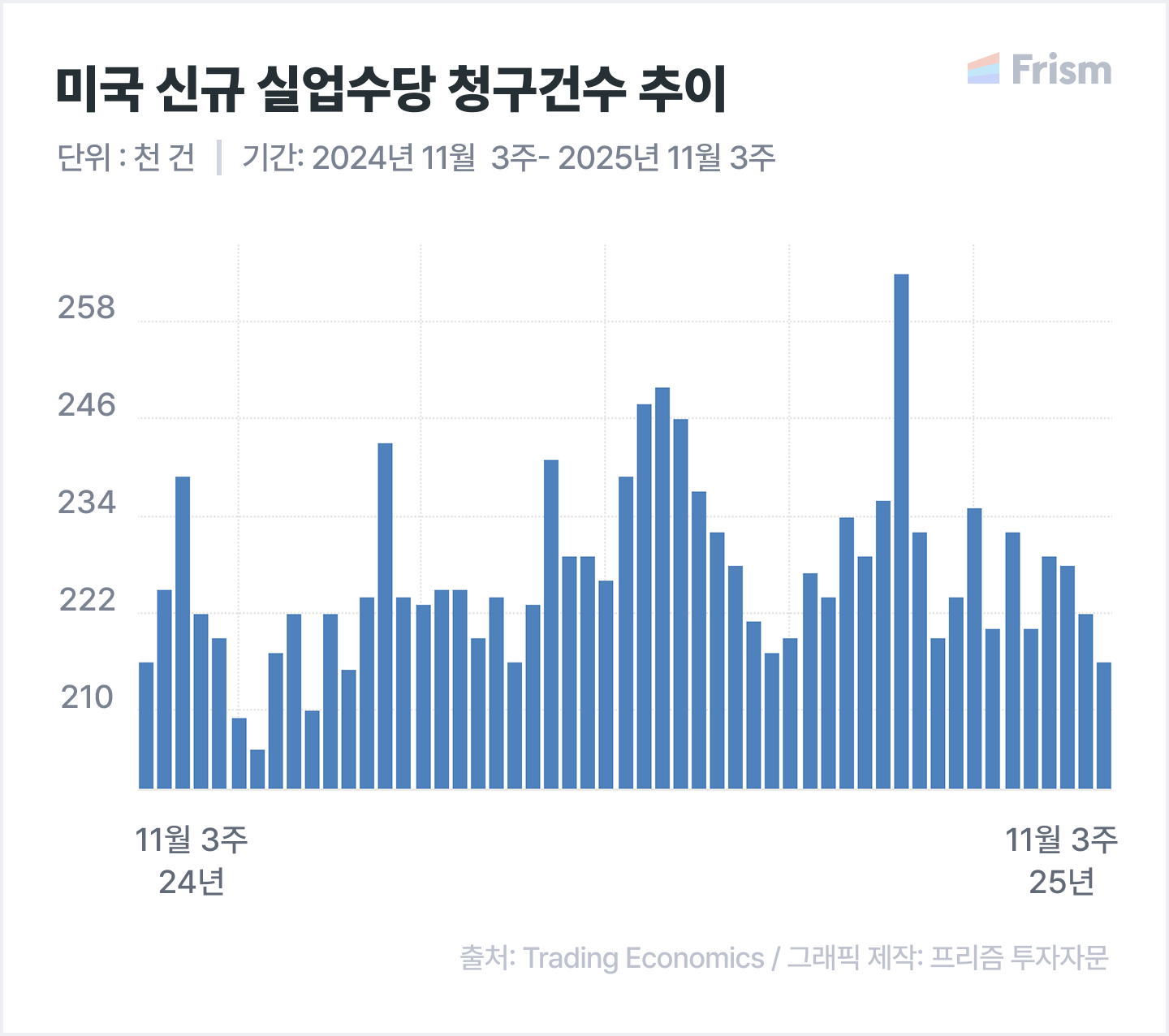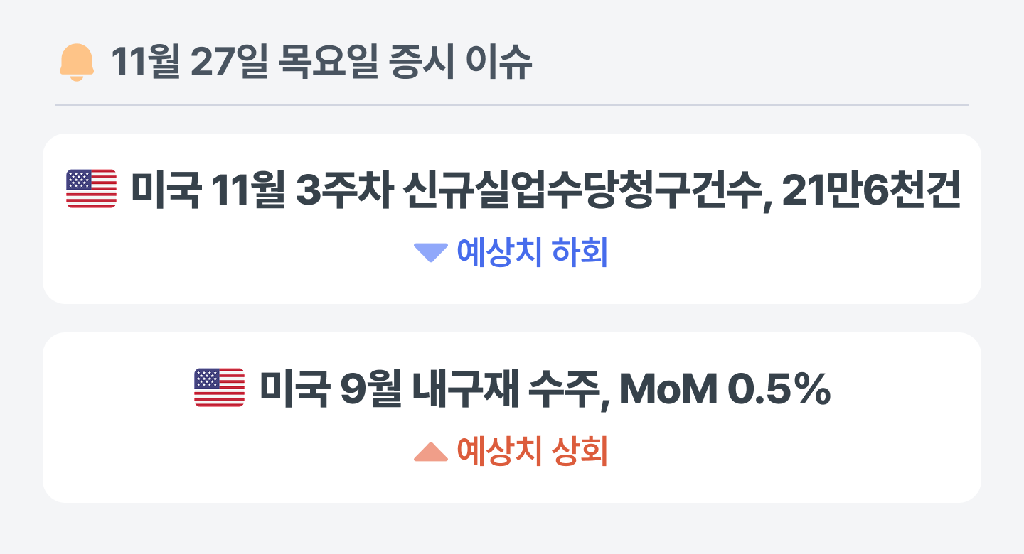 미국 11월 3주차(~11월 22일) 주간 신규 실업수당 청구 건수는 이전 주보다 6,000건 감소한 21만6,000건으로 예상치(22만5,000건)를 하회했어요.
