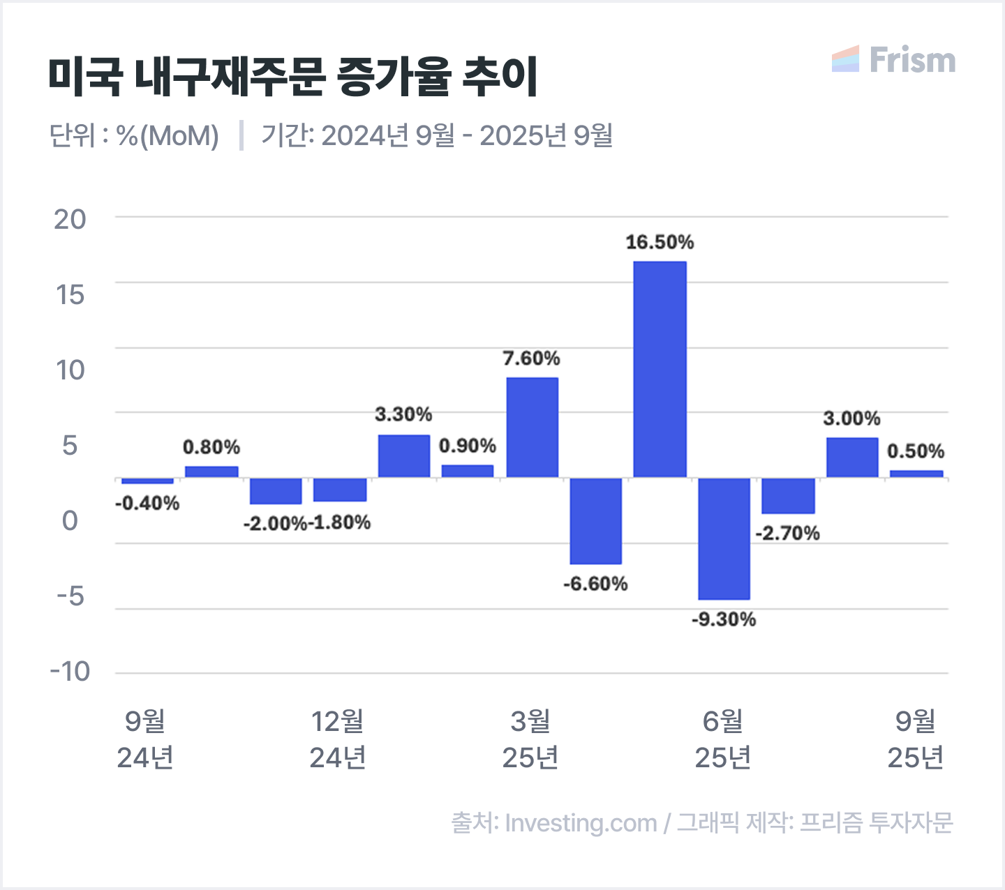 미국의 9월 내구재 수주는 전월 대비 0.5% 증가하며 예상치(0.3%)를 상회했어요.