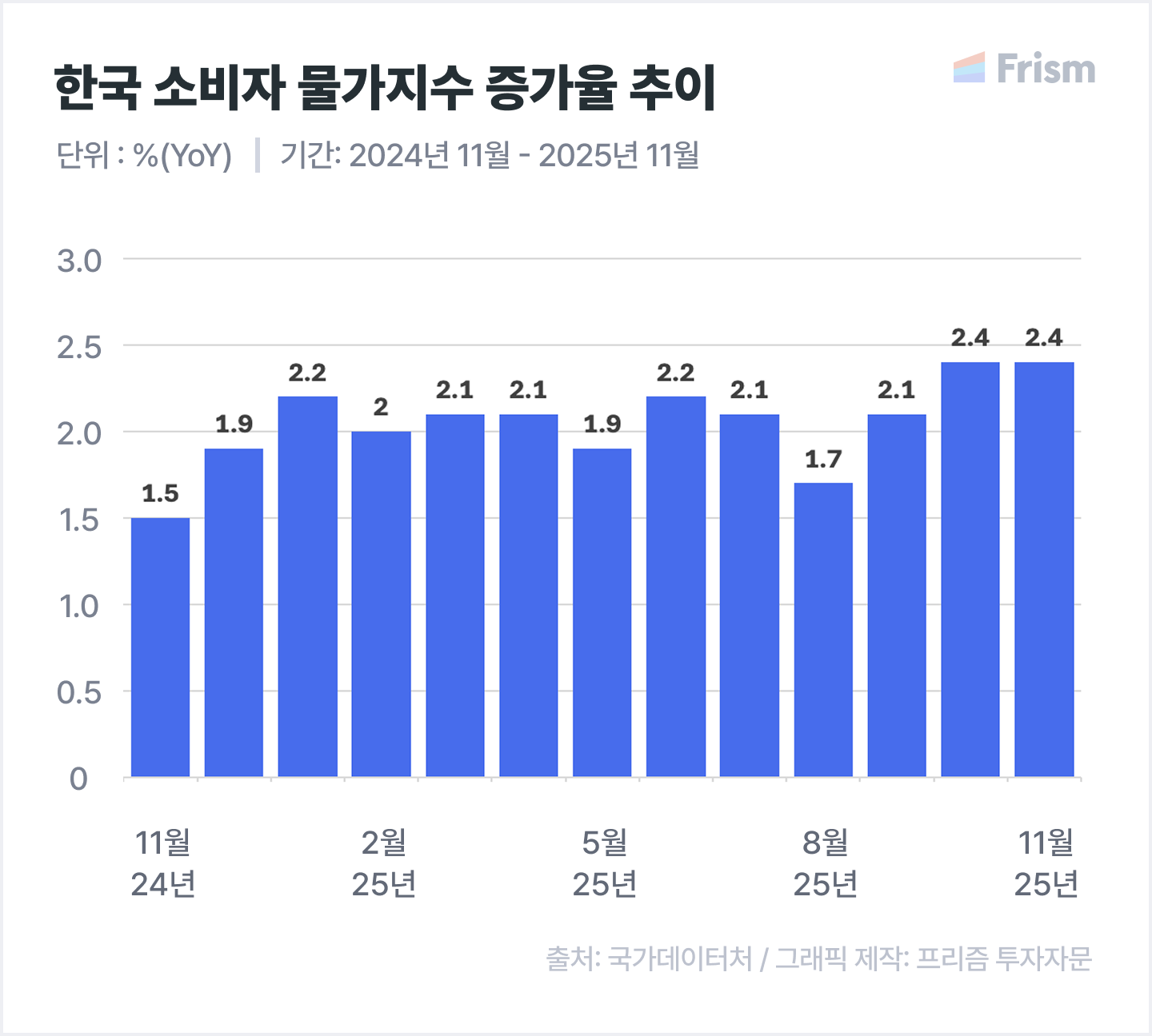 국가데이터처가 발표한 11월 소비자물가지수(CPI)는 117.20(2020=100)으로 전년 동월 대비 2.4% 상승했어요.