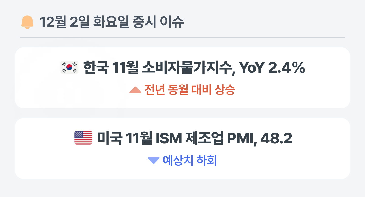 미국 공급관리협회(ISM)에 따르면 11월 제조업 구매관리자지수(PMI)는 48.2로 전월(48.7) 대비 0.5p 하락하며 기준선(50) 아래에서 9개월 연속 위축 국면을 이어갔어요. 시장 예상치(48.6)도 하회했어요.