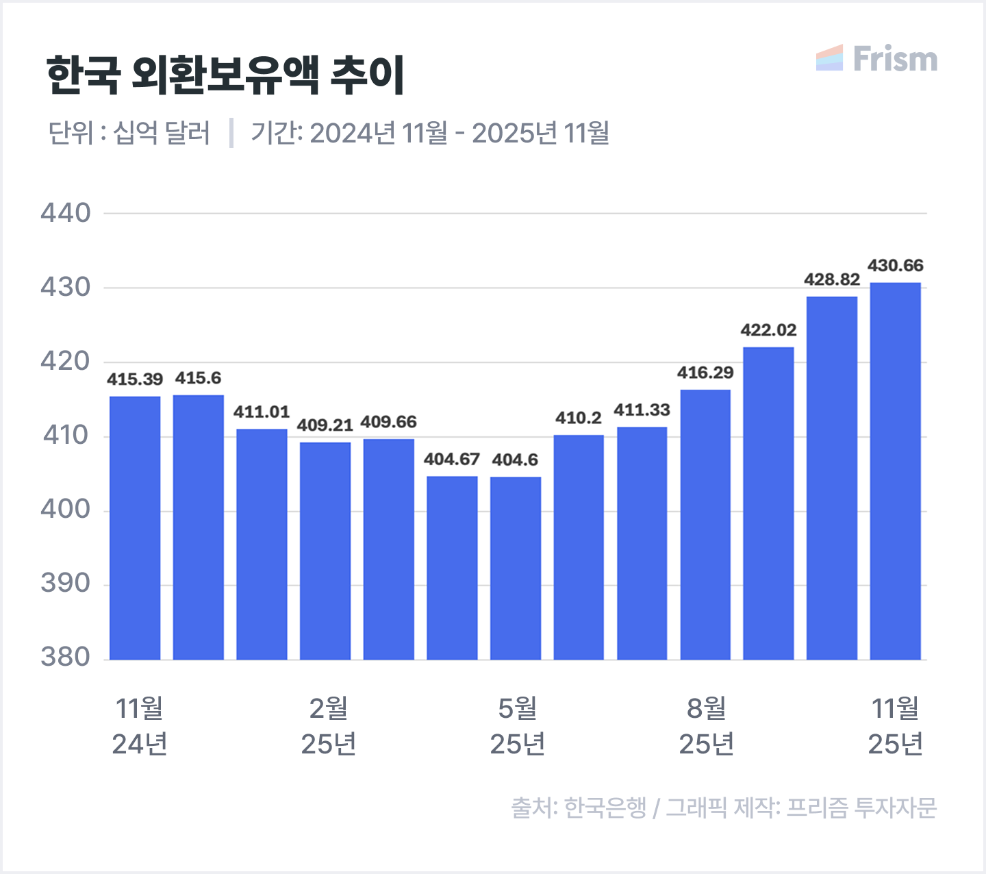 한국은행이 발표한 ‘2025년 11월 말 외환보유액’에 따르면 우리나라 외환보유액은 4,306억6천만 달러로 전달 대비 18억4천만 달러 증가했어요.