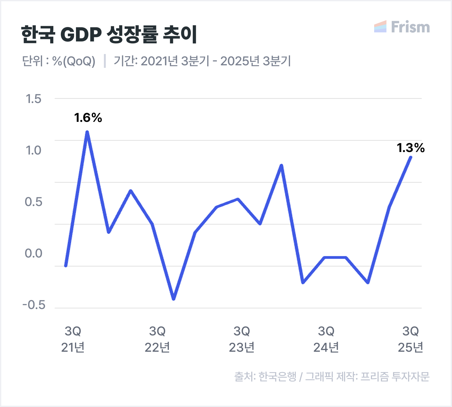3분기 성장률은 내수 회복과 투자 증가가 성장세를 이끌었다고 해요. 정부의 소비쿠폰 정책 효과 등에 따라 내수 회복세가 컸고, 내수 기여도는 1.2%p로 2분기(0.4%p) 대비 크게 확대되었다고 해요.