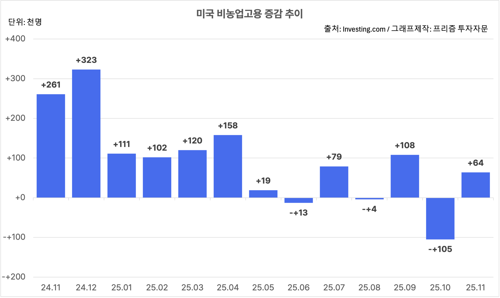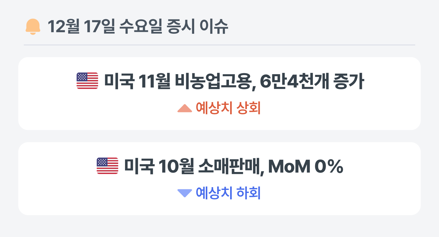 10월 비농업 고용은 10만 5,000명 감소, 11월 비농업 고용은 6만 4,000명 증가하며 예상치(5만명 증가)를 상회했어요.