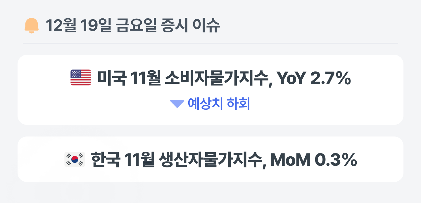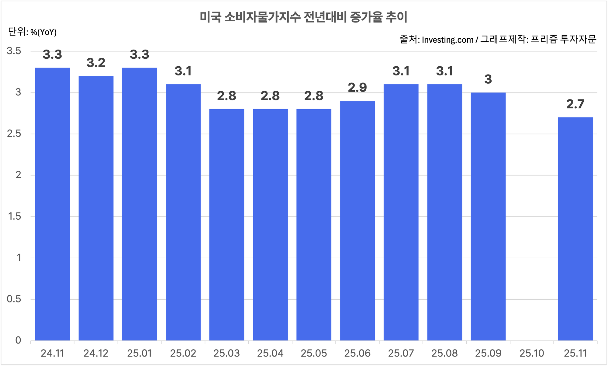 미국의 11월 소비자물가지수(CPI) 상승률이 2.7%로 집계되며 예상치(3.1%)를 하회했어요.