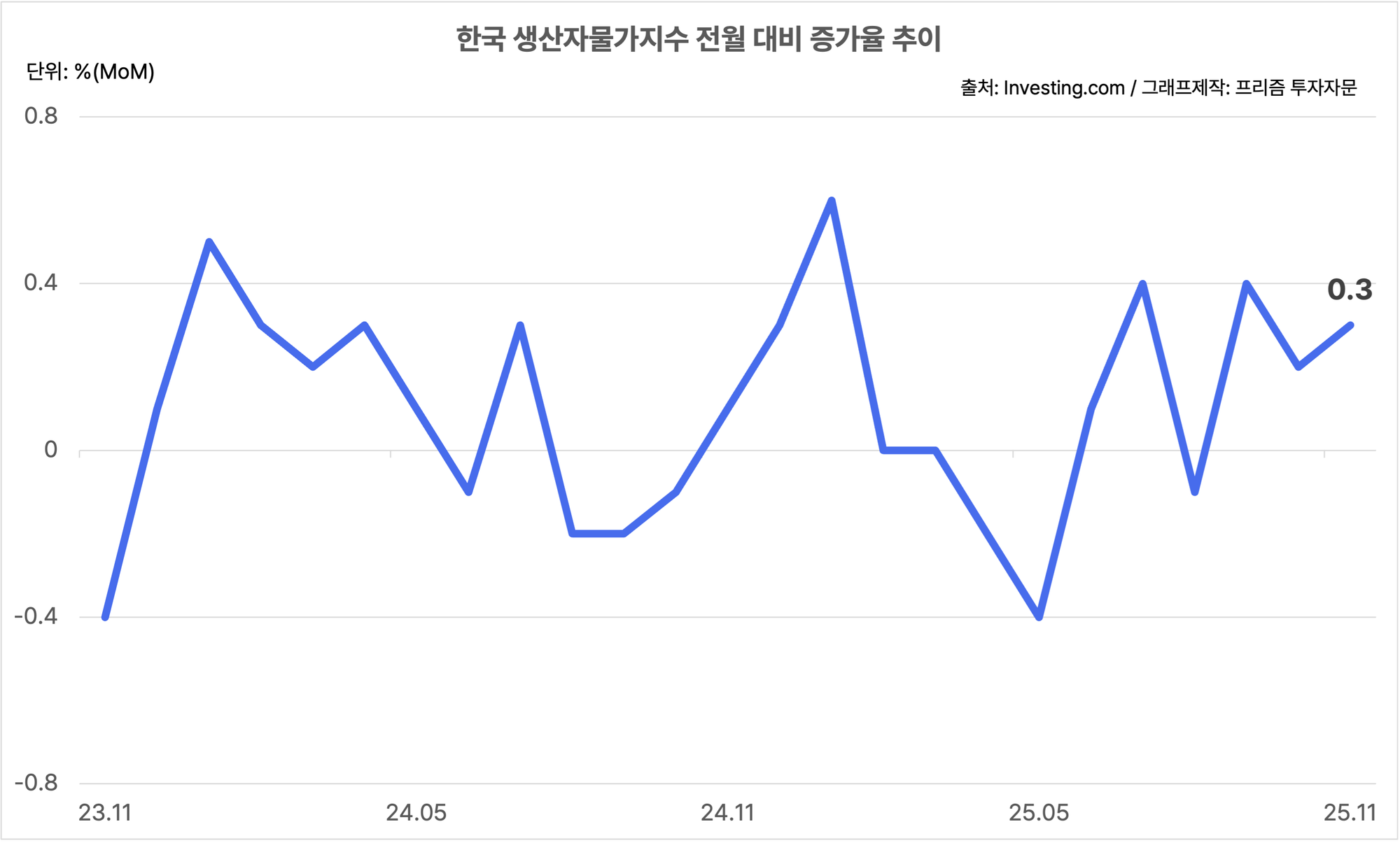19일 발표된 한국 11월 생산자물가는 전월 대비 0.3% 상승하며 세달 연속 오름세를 이어가고 있어요.