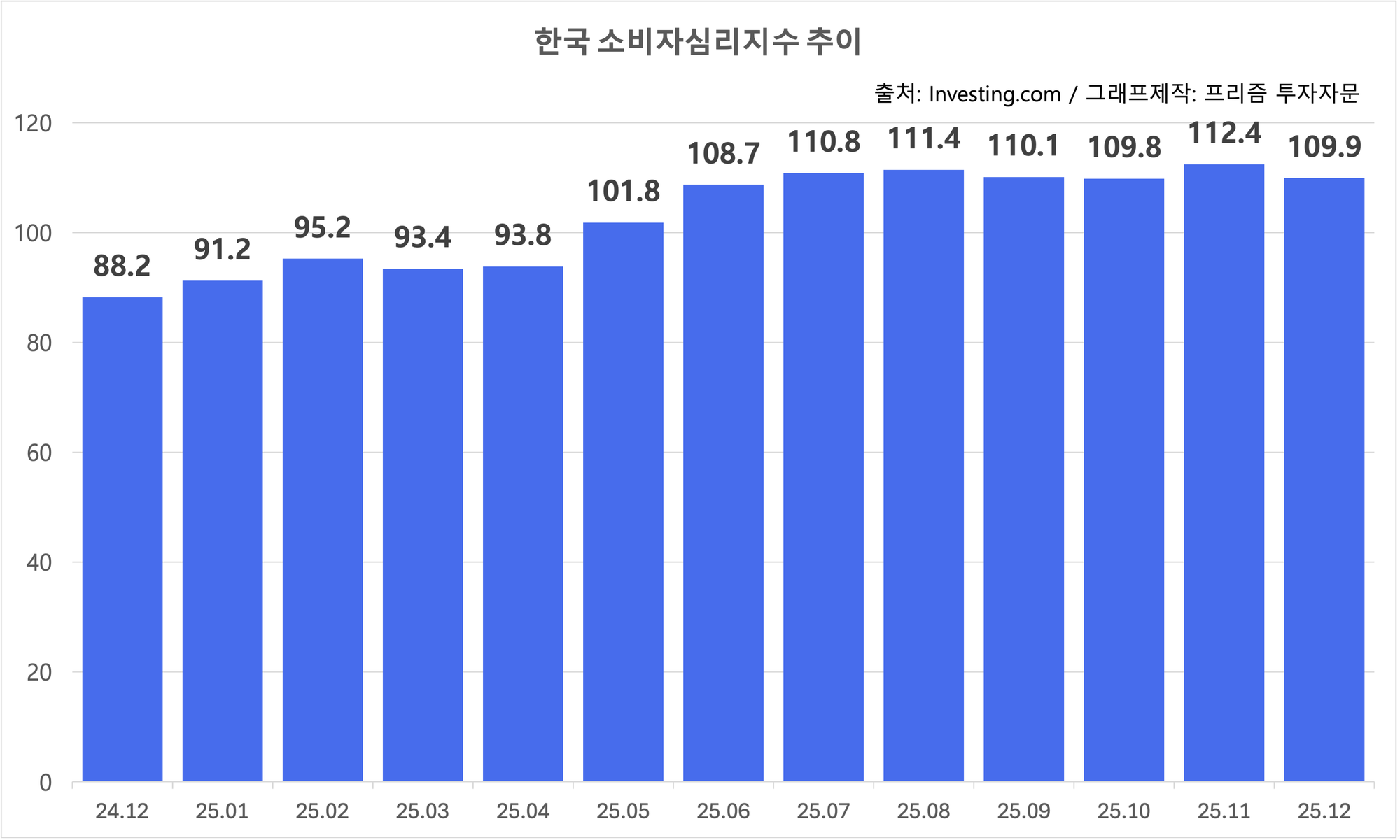 한국 12월 소비자심리지수 109.9 (전월 대비 하락)