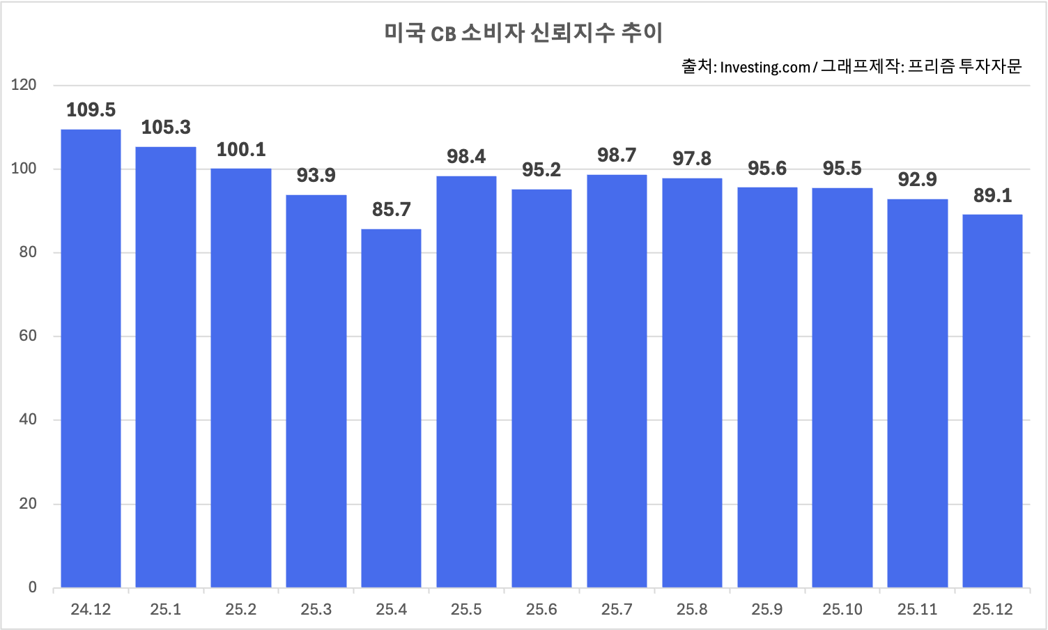 미 경제조사기관 콘퍼런스보드(CB)는 23일(현지시간) 12월 소비자신뢰지수가 89.1(1985=100 기준)을 기록했다고 밝혔어요. 이는 전월(92.9) 대비 3.8포인트 하락한 수치로, 예상치(91)를 하회했어요.