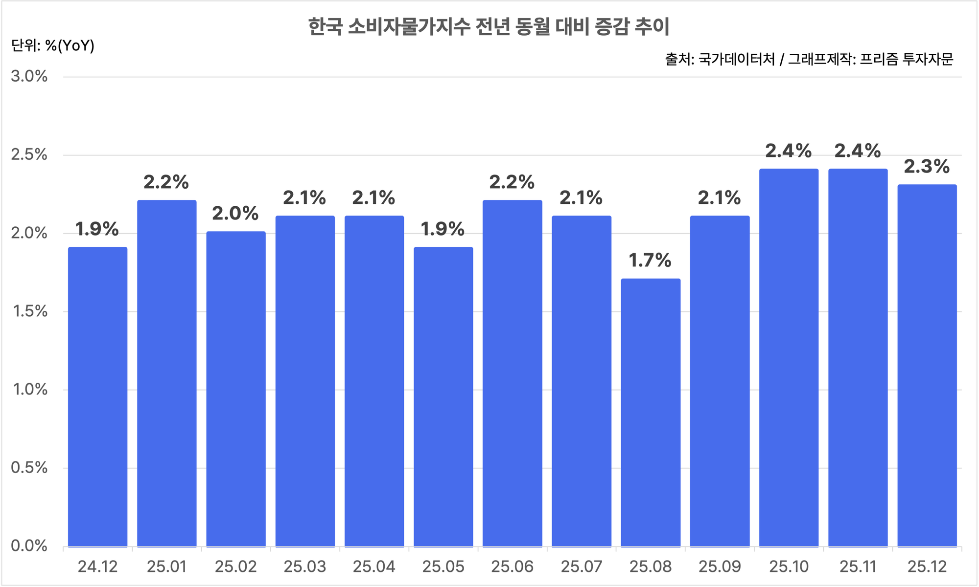 올해 2.1%는 2020년 이후 5년 만에 가장 낮은 상승률이지만, 정부가 ‘2025년 경제정책방향’에서 제시한 전망치 1.8%를 0.3%p 상회했고, 한국은행의 물가안정 목표치 2.0%도 소폭 웃도는 수준이에요.
