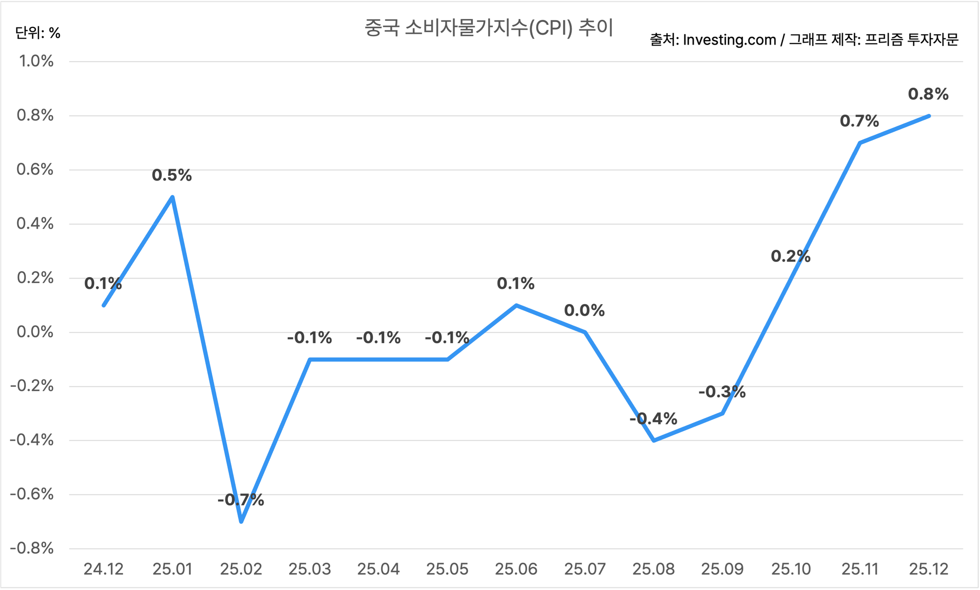 중국의 12월 소비자물가지수는 0.8%에요.