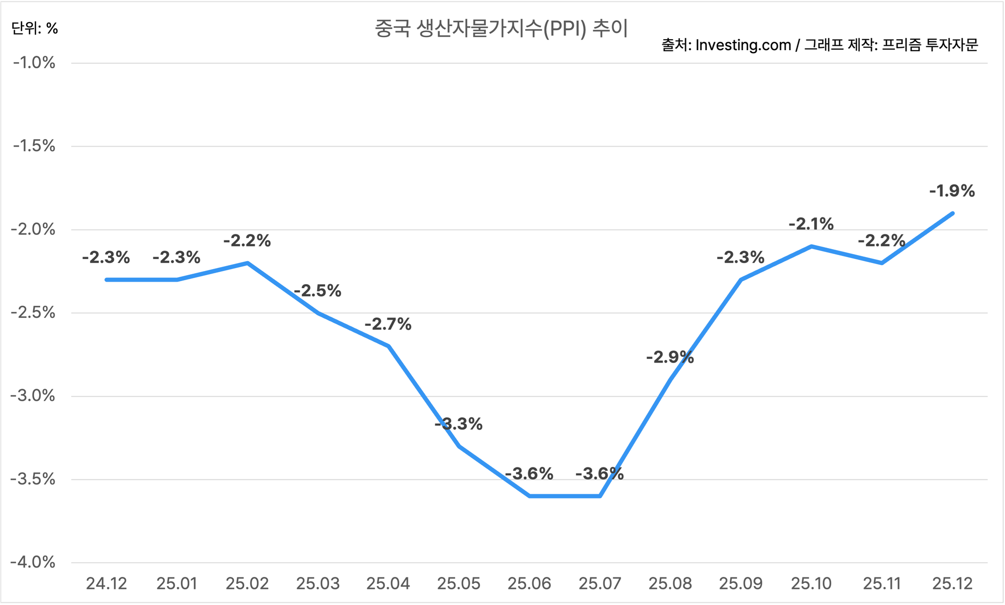 중국의 12월 생산자물가지수는 -1.9%에요.