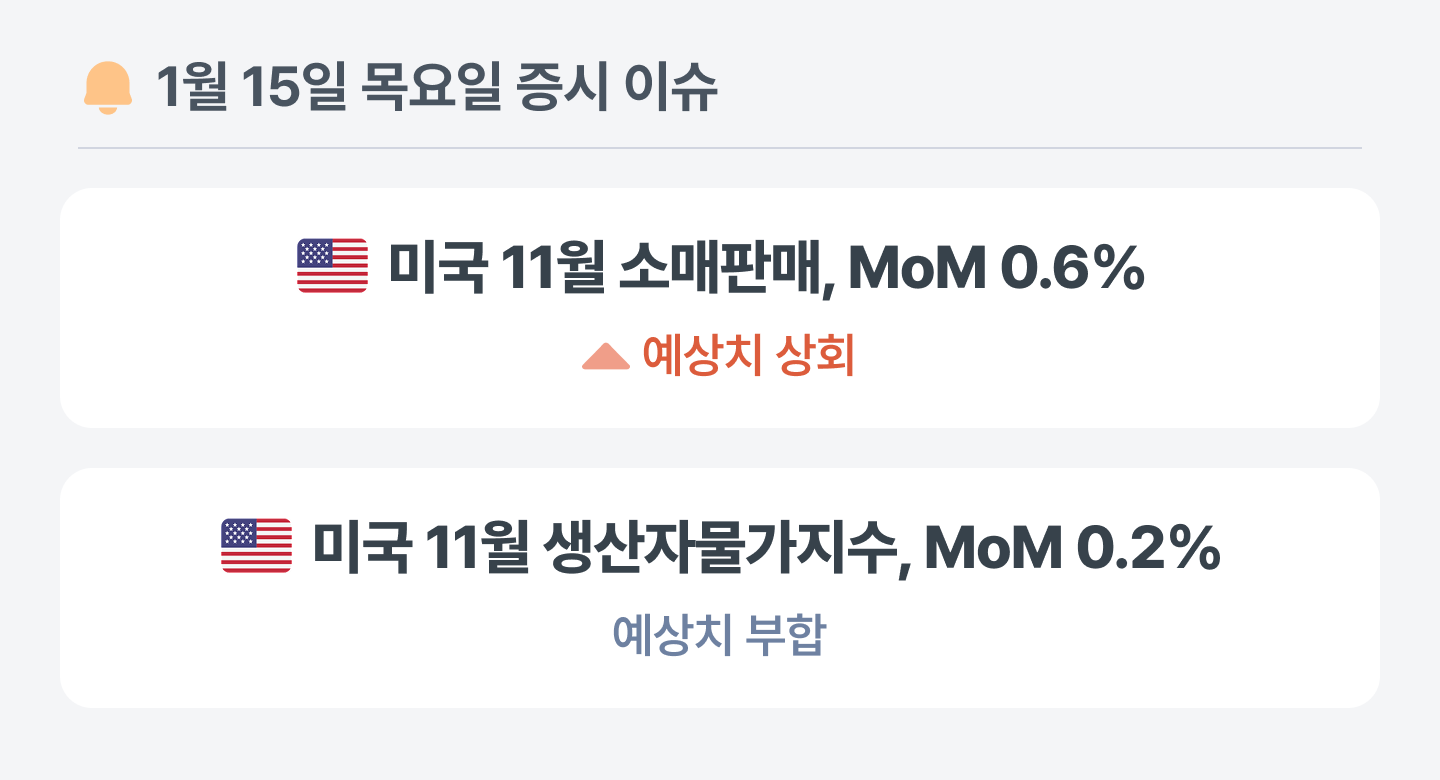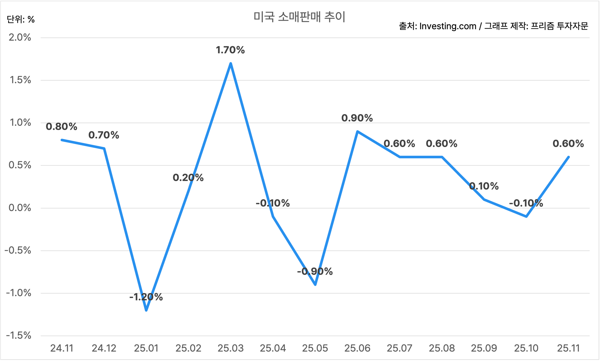 11월 소매판매는 예상치를 상회하며 소비 흐름이 생각보다 쉽게 꺾이진 않는 모습이에요. 다만 업종별·계층별로 체감 온도 차가 남아 있는 만큼, 강한 흐름이 넓게 확산되는지 여부는 조금 더 지켜볼 필요가 있어 보여요.