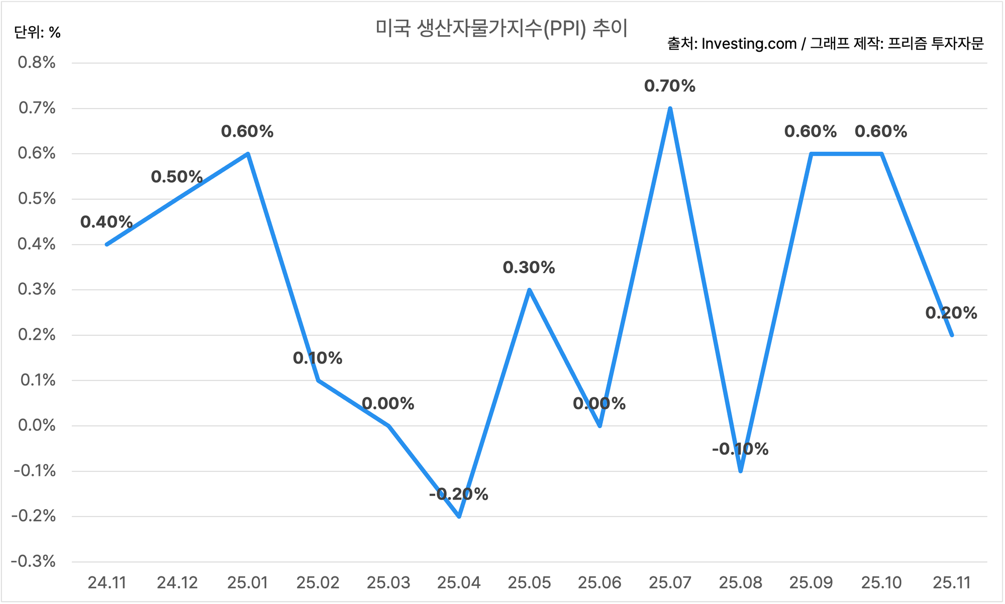 11월 PPI는 예상에 부합하며, 전반적으로 가격 압력이 추가로 강해지는 모습은 제한적으로 보였어요. 다만 관세 전가가 정점에 가까워졌다는 해석이 나온 만큼, 향후에는 상품 쪽 가격·수요 흐름이 어떤 방향으로 정리되는지 지켜볼 필요가 있어 보여요.