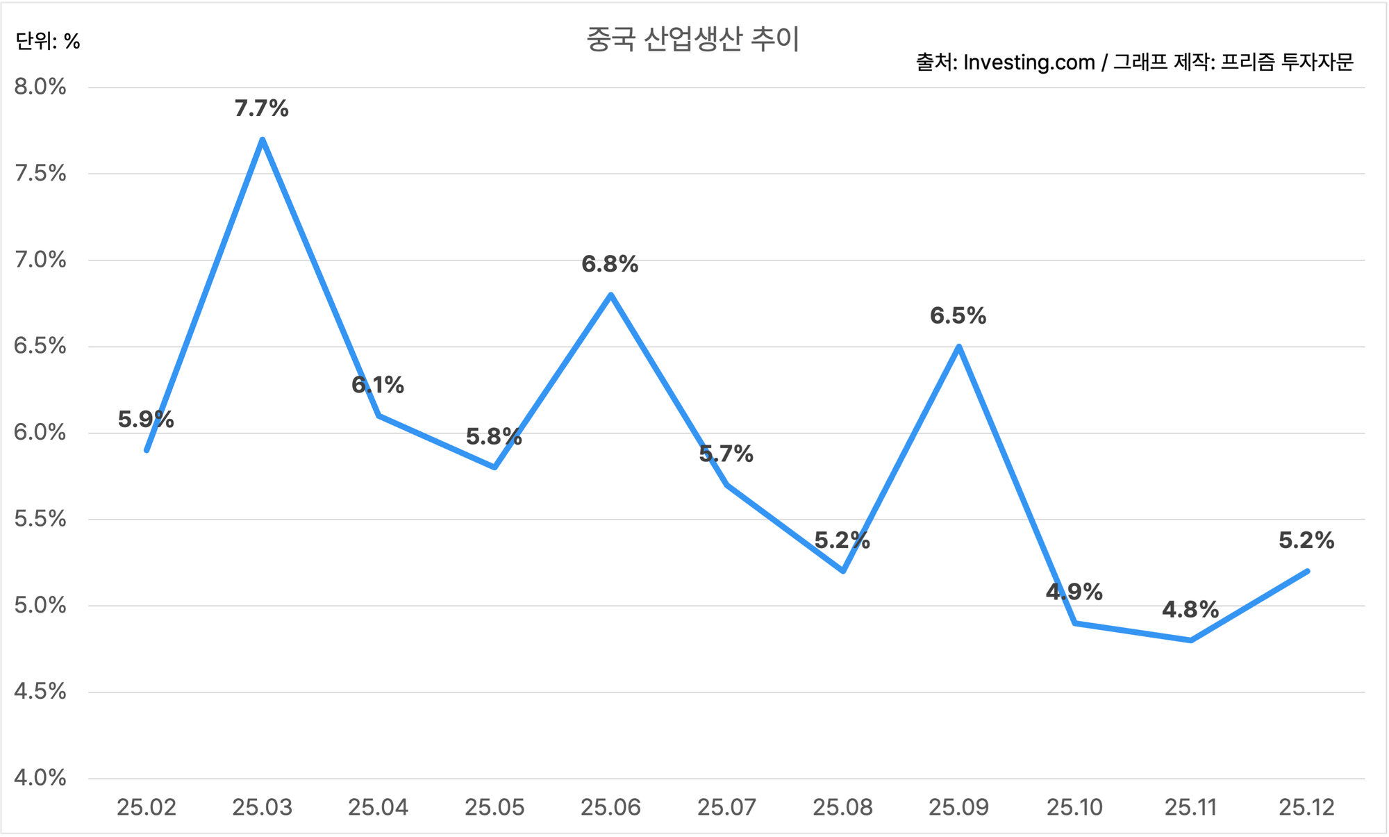 중국의 12월 산업생산은 YoY 5.2%에요.