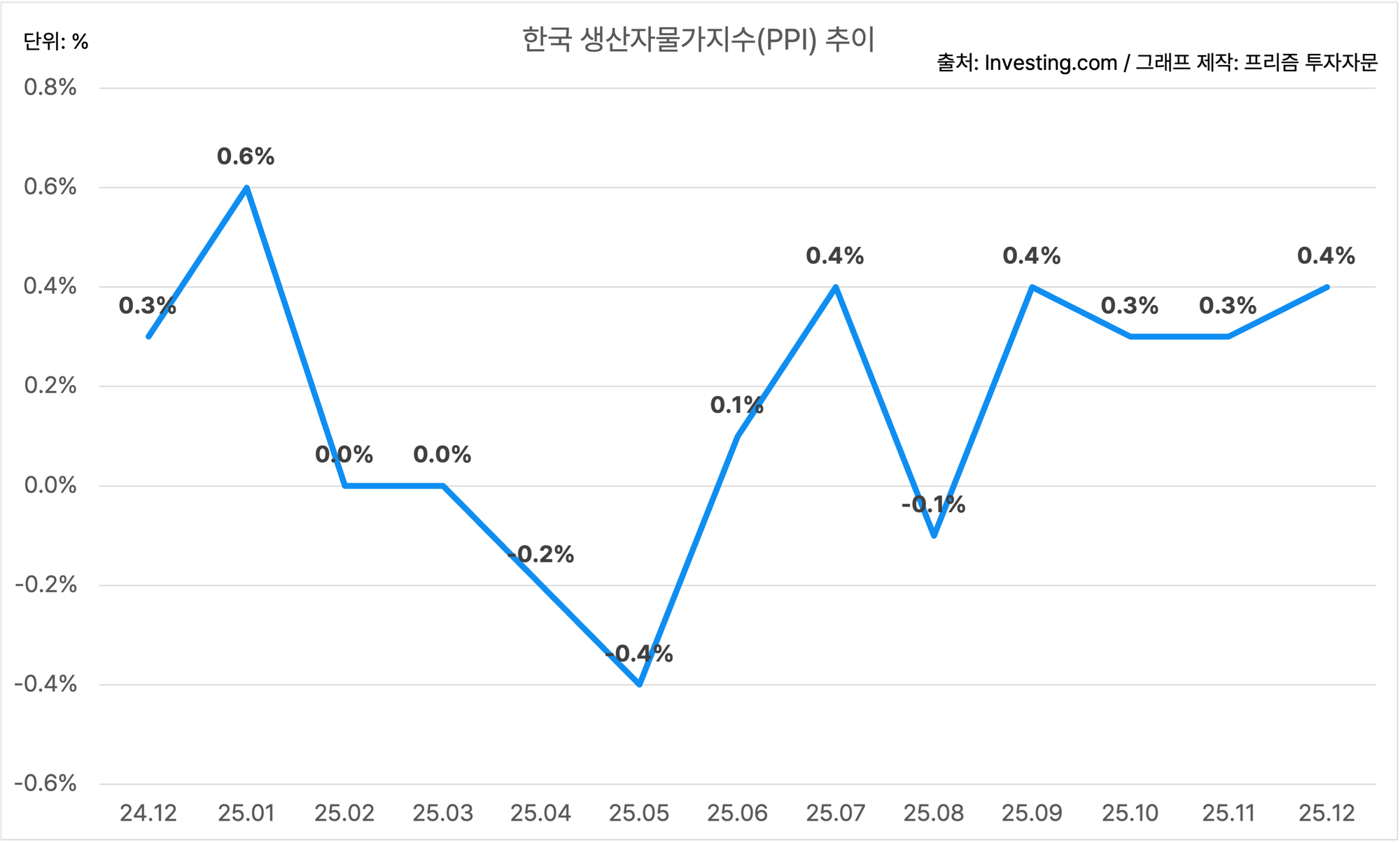 한국의 12월 생산자물가지수는 MoM 0.4%에요.