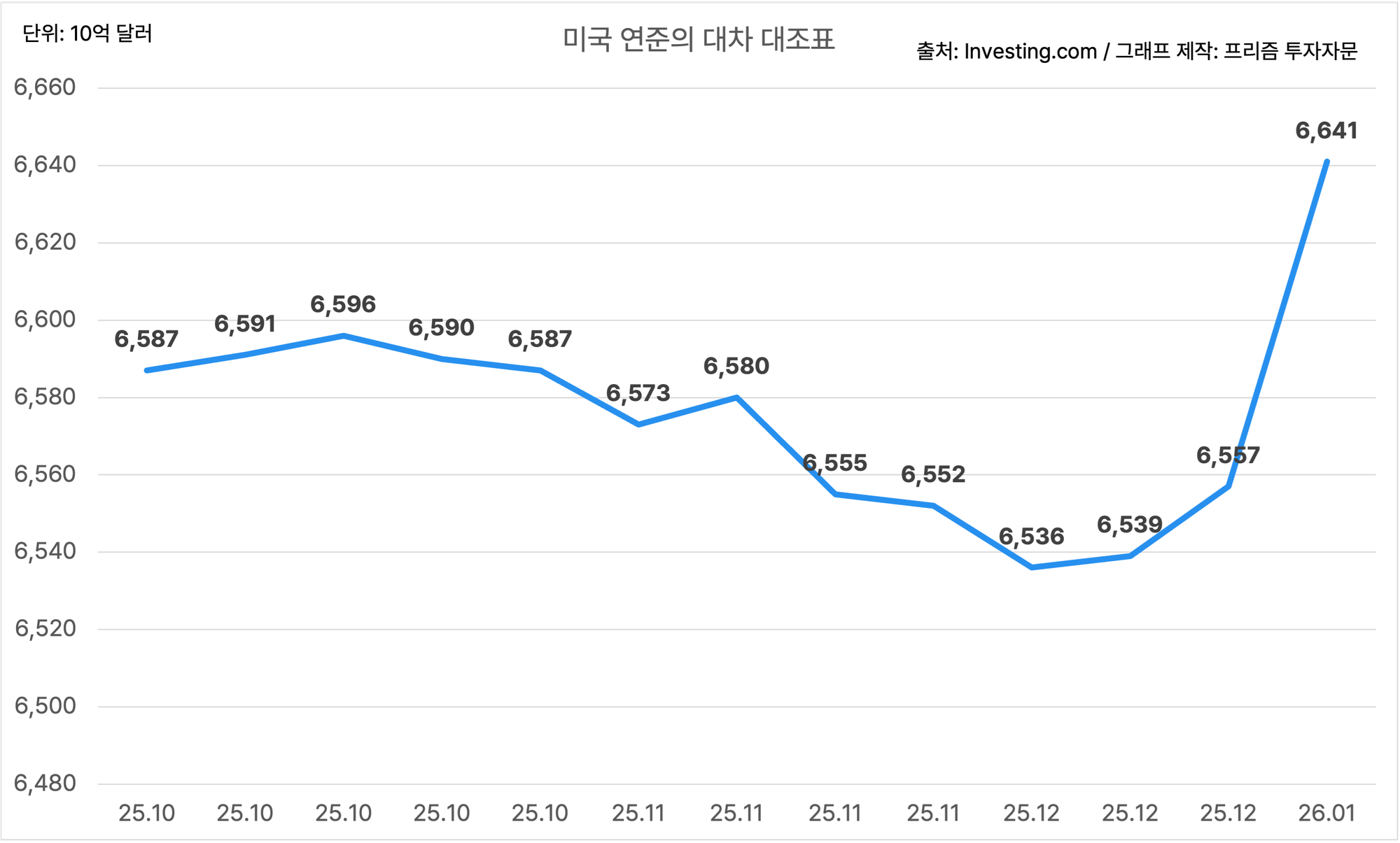 미국 연준의 1월 3일 발표한 대차대조표는 $6,641B로 이전치인 $6,557B 대비 상승했어요.