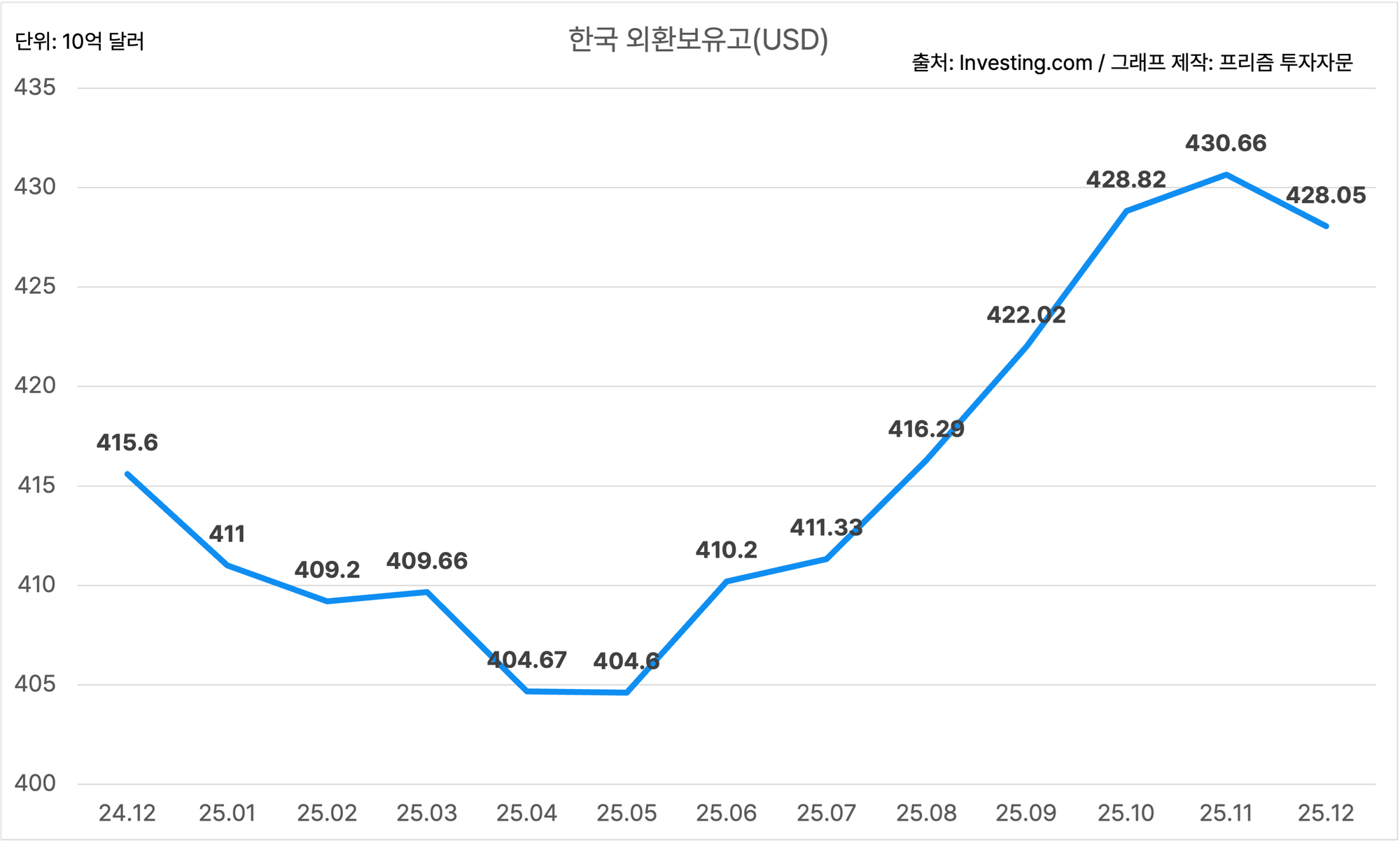 미 한국 12월 외환보유고(USD) $428.05B, 이전치 대비 하락