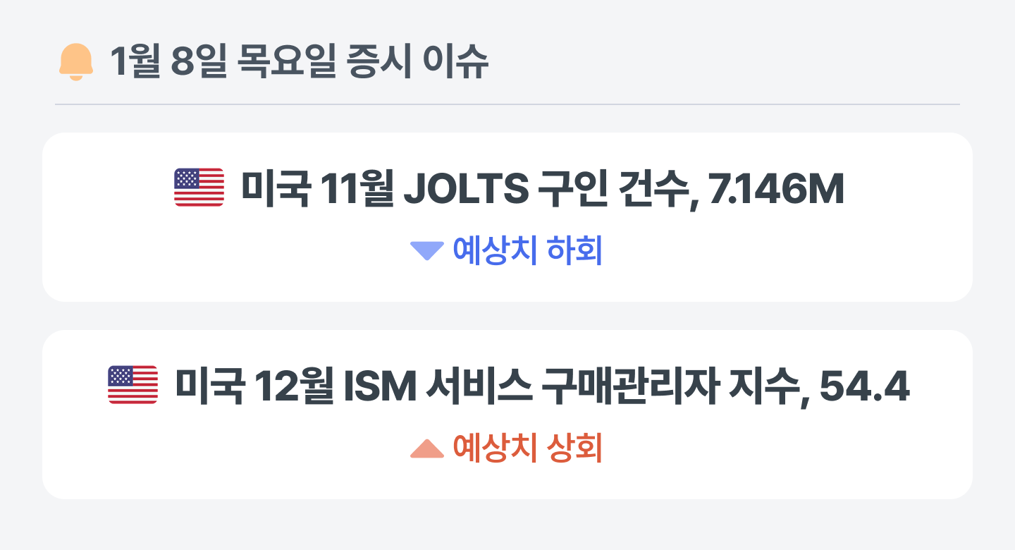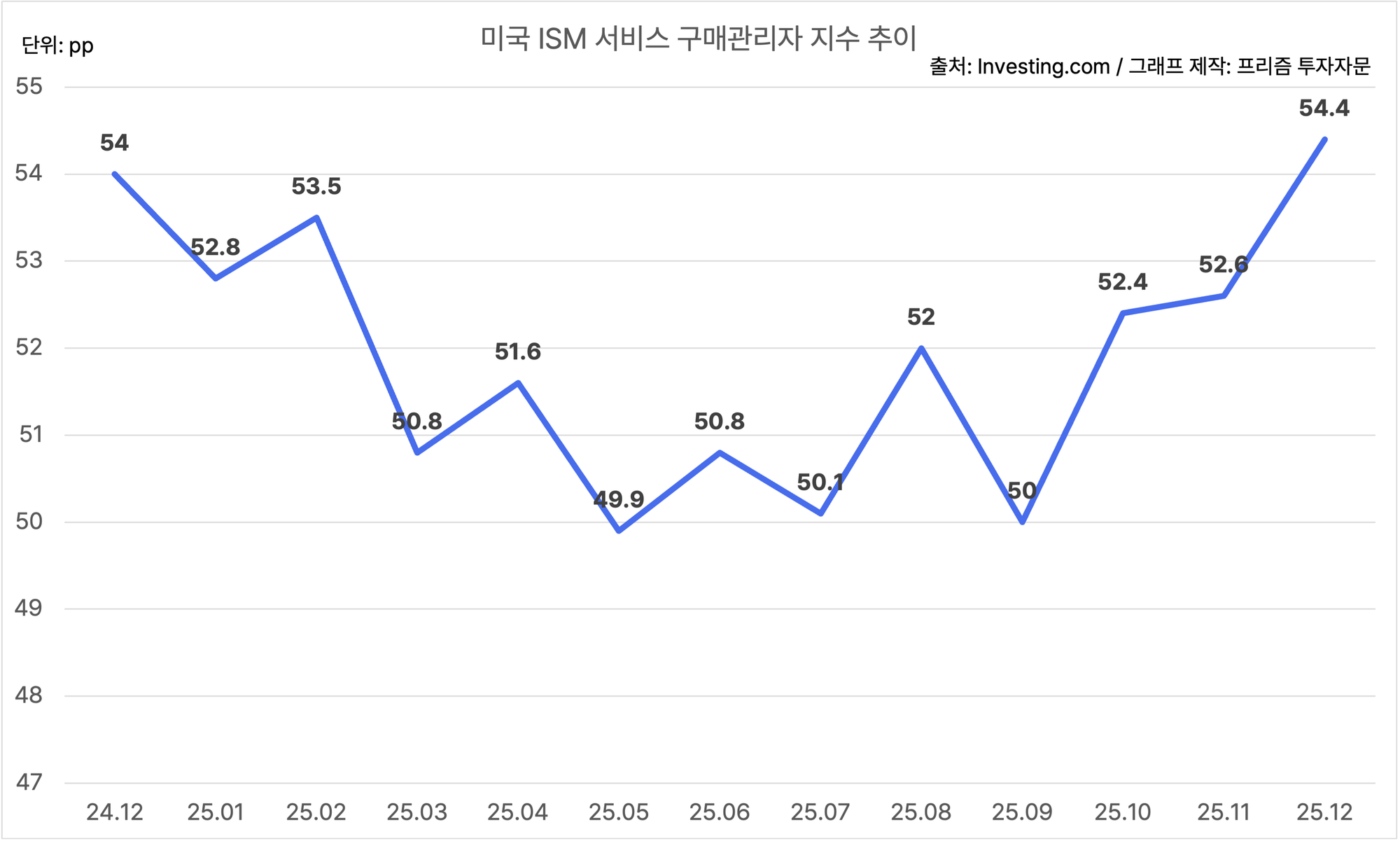 12월 ISM 서비스 PMI가 예상치를 상회하며 서비스업 확장 흐름이 다시 강해졌고, 기업활동·신규주문·고용 지수도 동반 개선된 점이 눈에 띄어요. 다만 서비스 지표가 강하게 나오면 성장뿐 아니라 물가·금리 기대에도 영향을 줄 수 있는 만큼, 향후 시장은 지표 개선이 수요의 지속성으로 이어지는지까지 함께 확인하려는 흐름이 나타날 수 있어 보여요.