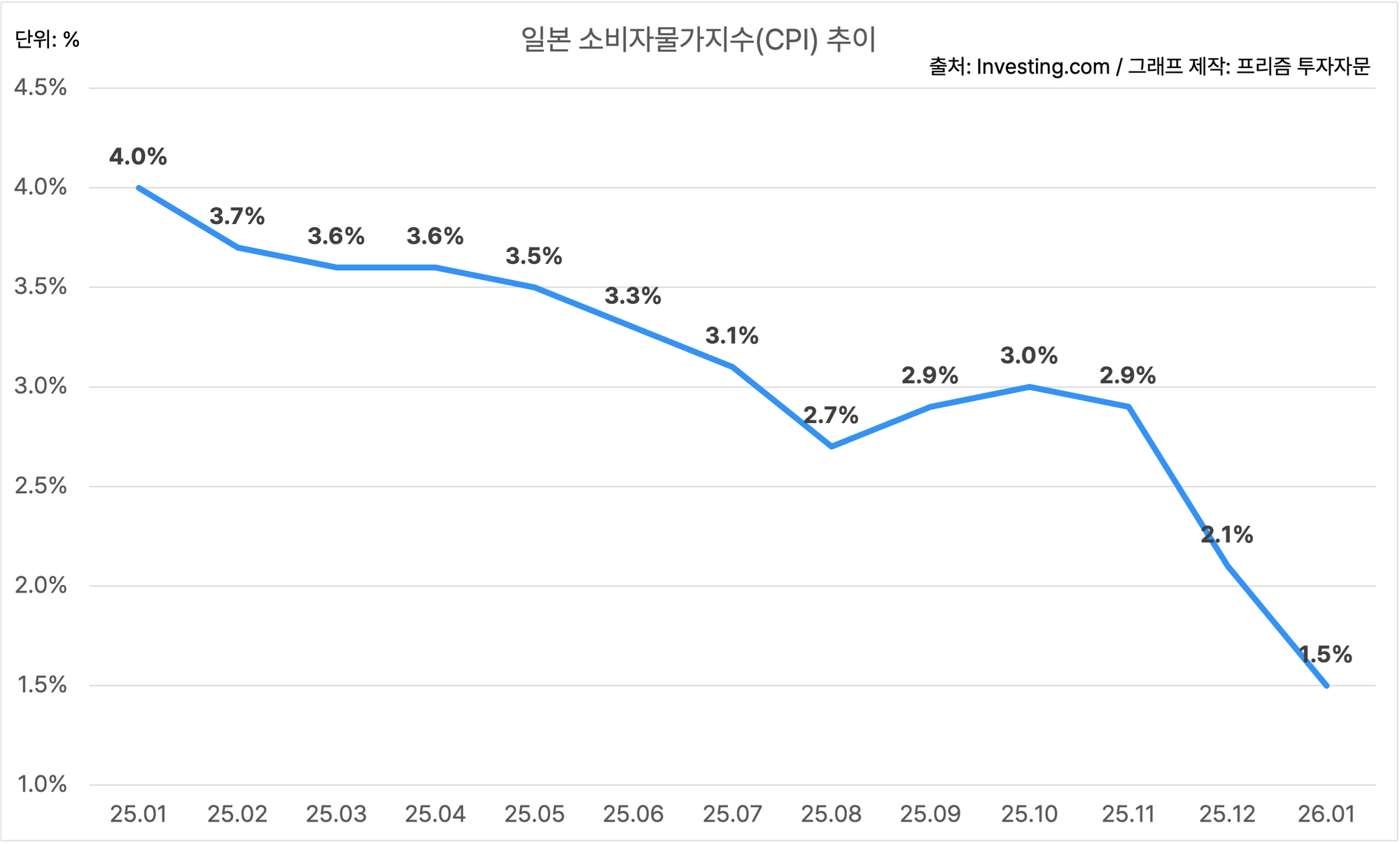 일본의 1월 소비자물가지수는 YoY 1.5%에요.