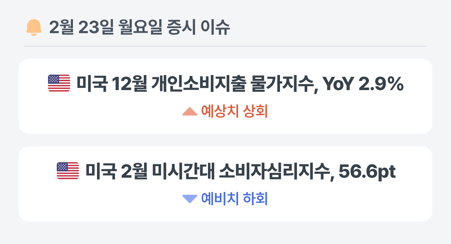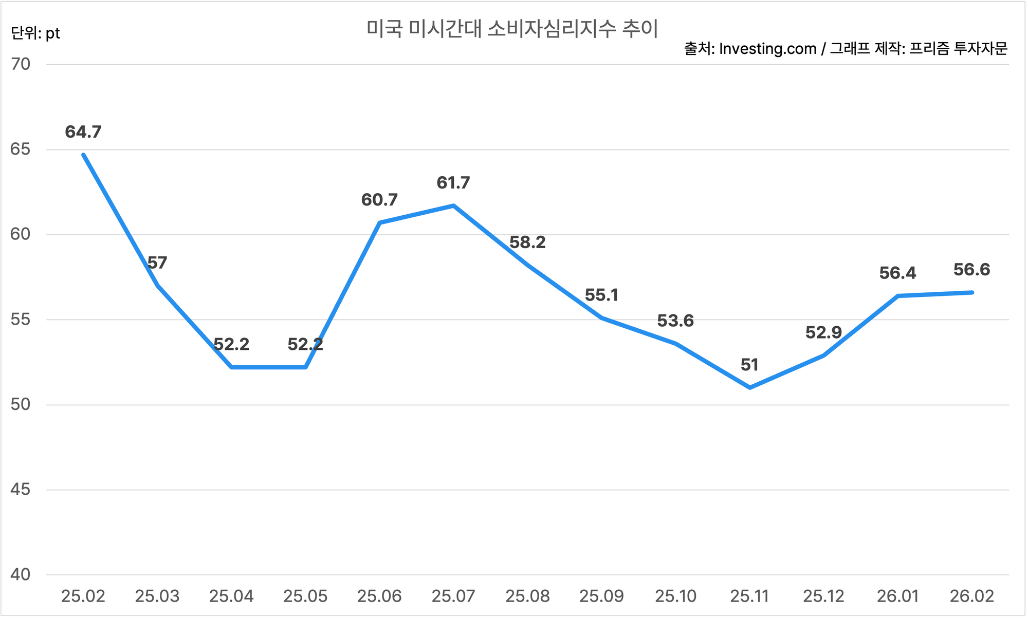 미국의 2월 미시간대 소비자심리지수는 예비치를 하회하며 뚜렷한 반등 없이 다소 정체된 흐름이에요. 현재 경제 여건과 미래 기대 심리가 엇갈리는 가운데 자산과 소득 수준에 따른 체감 경기의 차별화가 두드러지고 있어, 고소득층의 견고한 심리가 전체 소비 시장의 하방을 얼마나 지지해 줄지 지켜볼 필요가 있어 보여요.