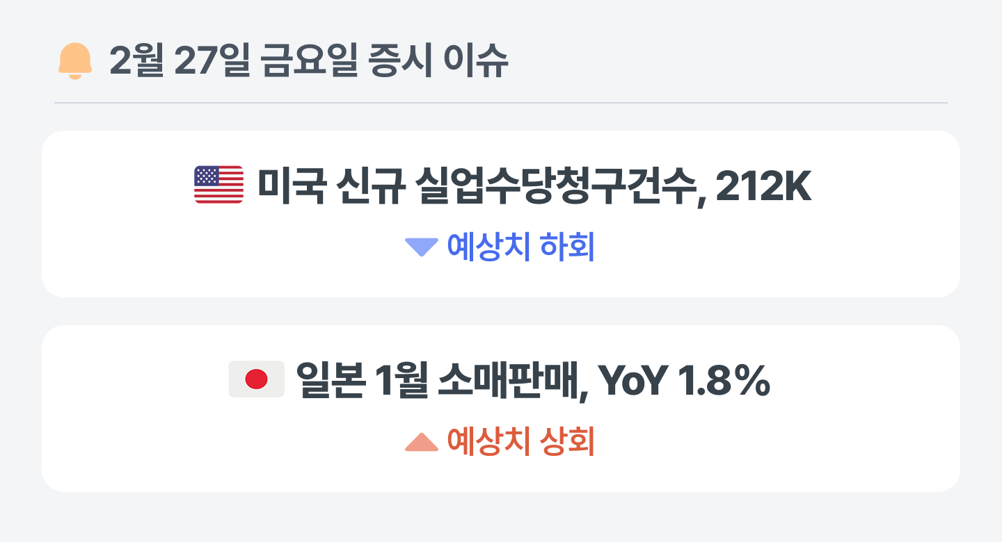 미국의 2월 주간 신규 실업수당 청구건수는 예상치를 하회했어요. 노동 수요의 동력이 약화된 가운데 실업급여 청구가 낮은 수준에 머무는 현상은 고용 시장의 탄력성 저하를 의미하며, 향후 증가보다 정체 흐름이 이어질 전망으로 해석할 수 있어요.