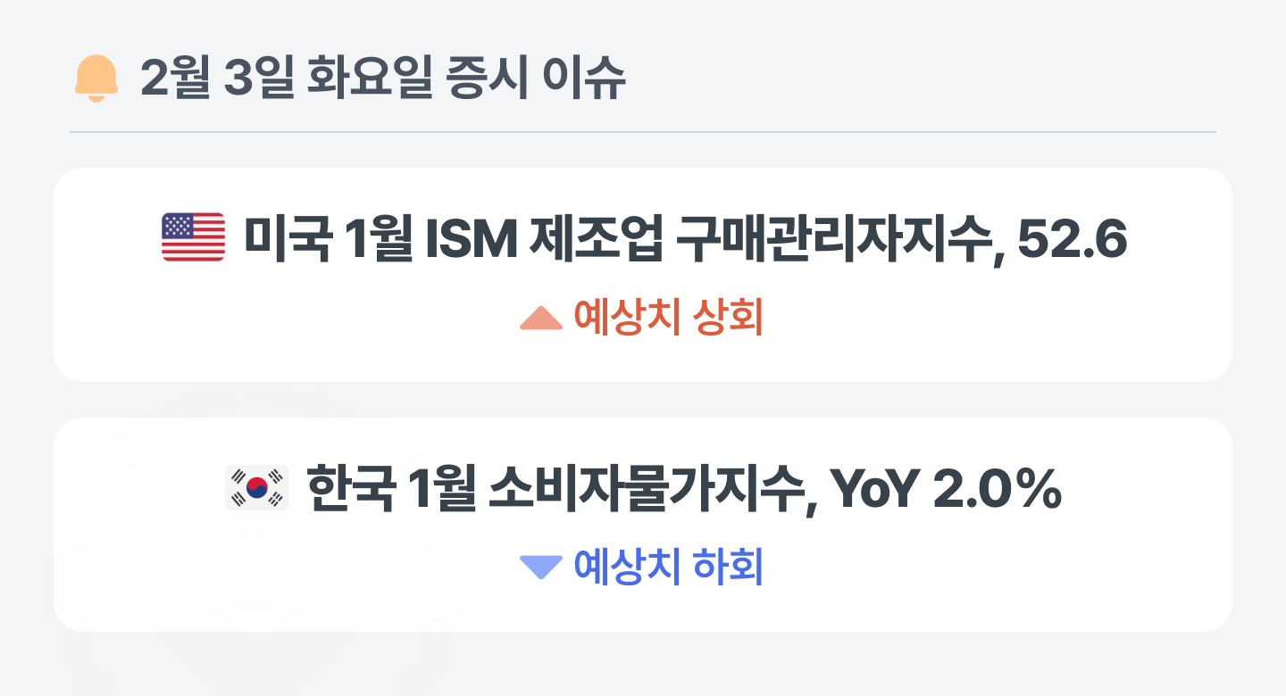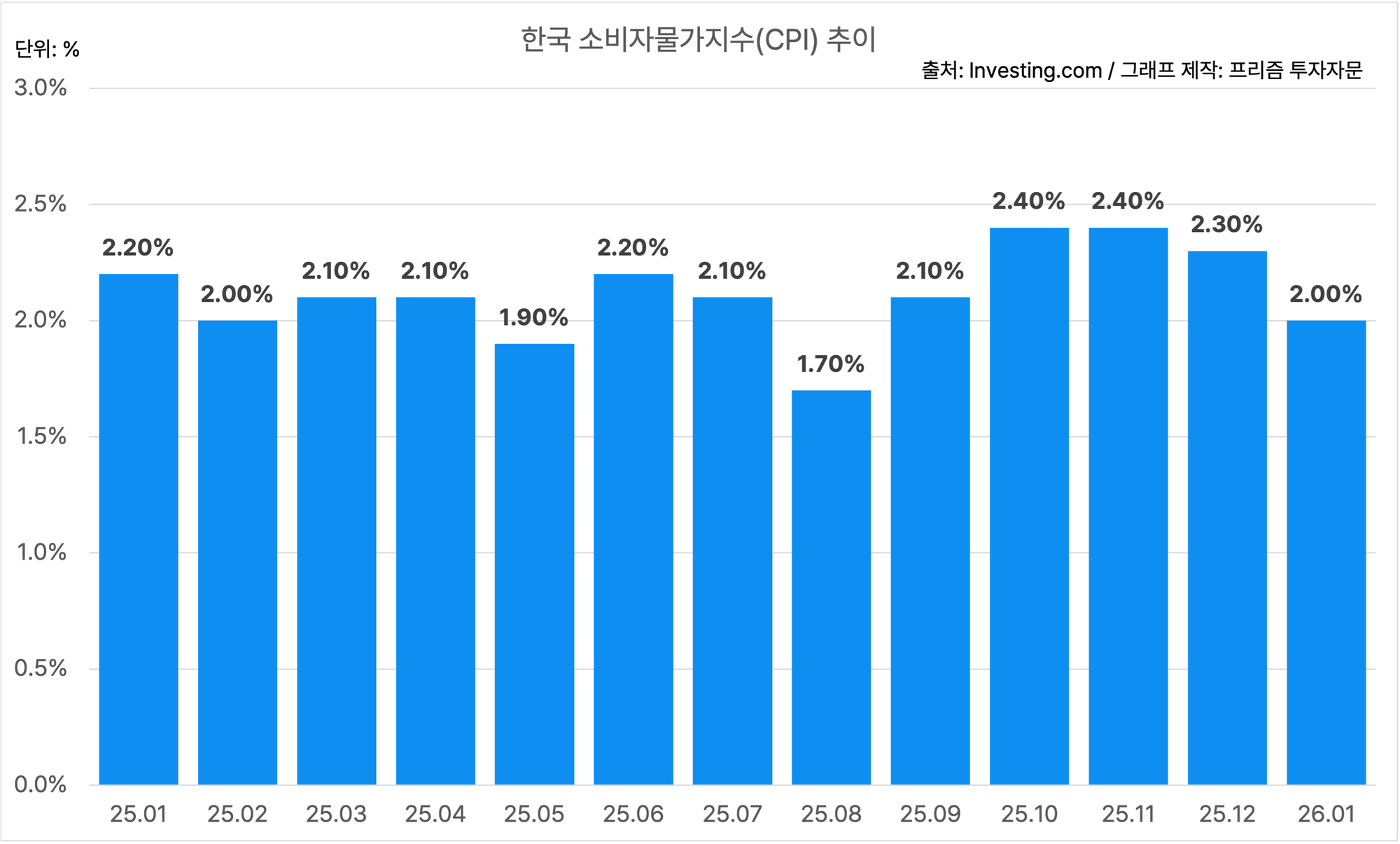 한국의 1월 소비자물가지수는 시장 예상치를 밑돌았고, 국제유가 하락에 따른 석유류 가격 안정과 농산물 상승 폭 둔화가 전체 물가 하방 압력을 강화한 모습이에요. 서비스 물가와 일부 수입 축산물 가격이 여전히 상방 변수로 작용하고 있으나, 전반적인 물가 둔화세가 가시화되는 흐름이에요.