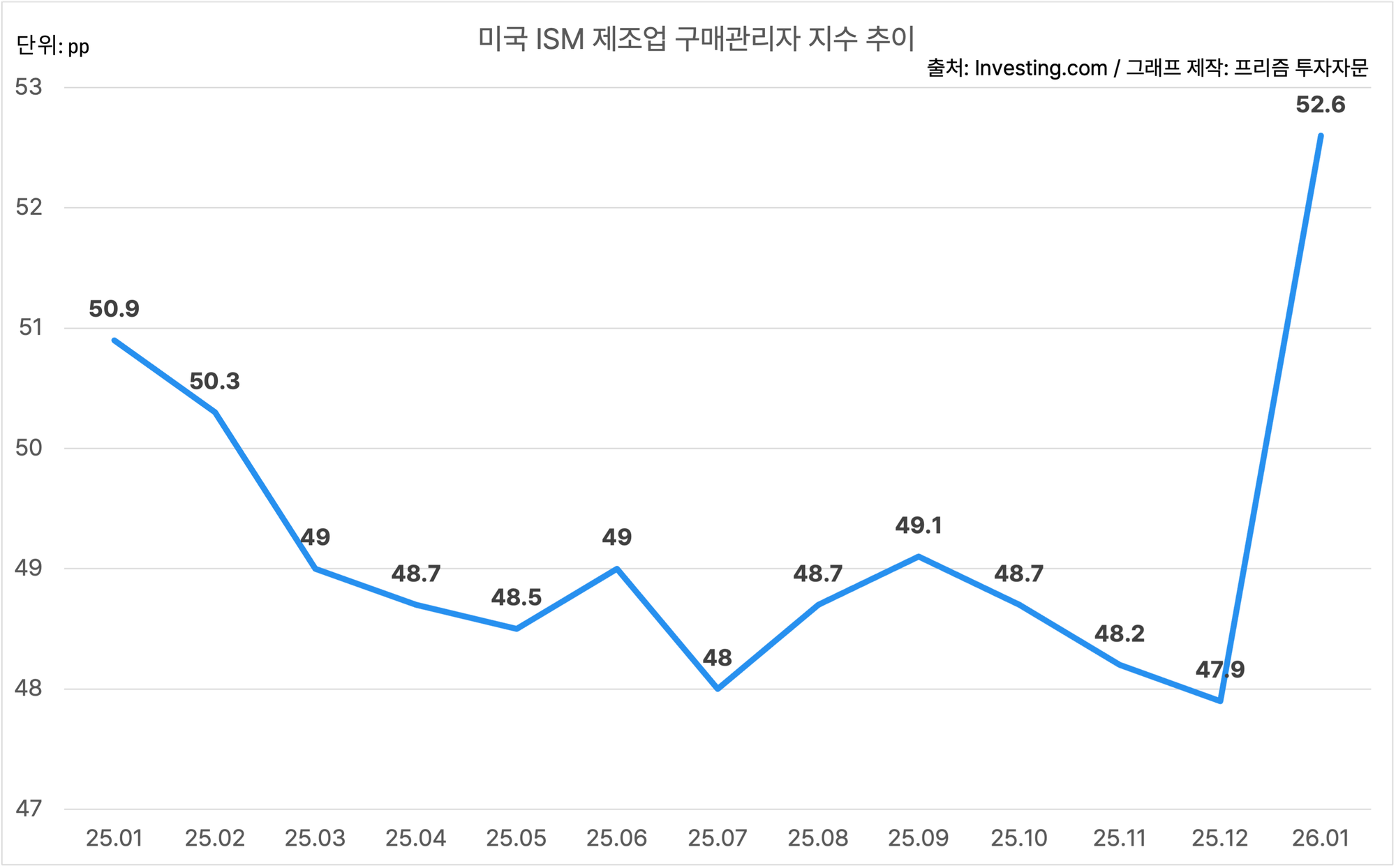 "미국 제조업 부문이 12개월 만에 처음으로 1월에 확장세로 돌아서면서 52.6을 나타냈다"