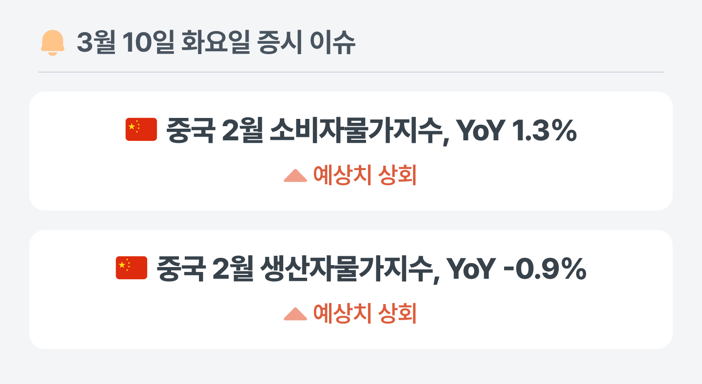 중국의 2월 생산자물가지수는 시장 예상치를 상회했으나, 여전히 마이너스권에 머물며 총수요 회복세가 아직은 공고하지 못한 분위기예요. 정부 차원에서 물가 상승 전환을 강력히 시사한 만큼, 정책 효과에 따른 디플레이션 압력의 점진적 완화 여부를 확인해야 하는 지점이에요.