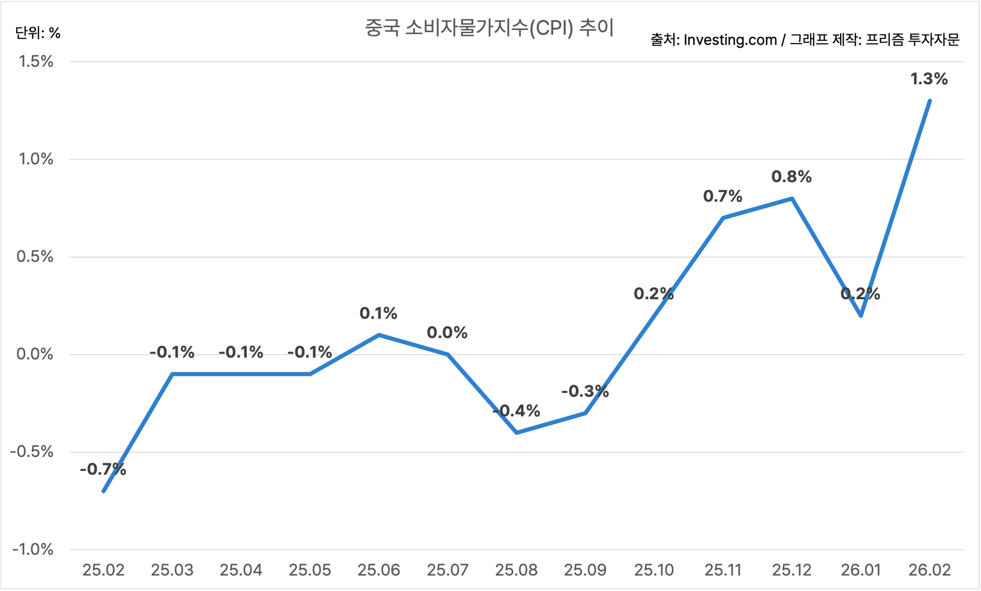 중국의 2월 소비자물가지수는 YoY 1.3%에요.