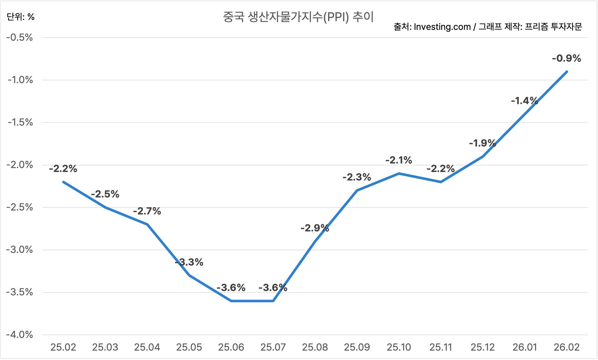 중국의 2월 생산자물가지수는 YoY -0.9%에요.