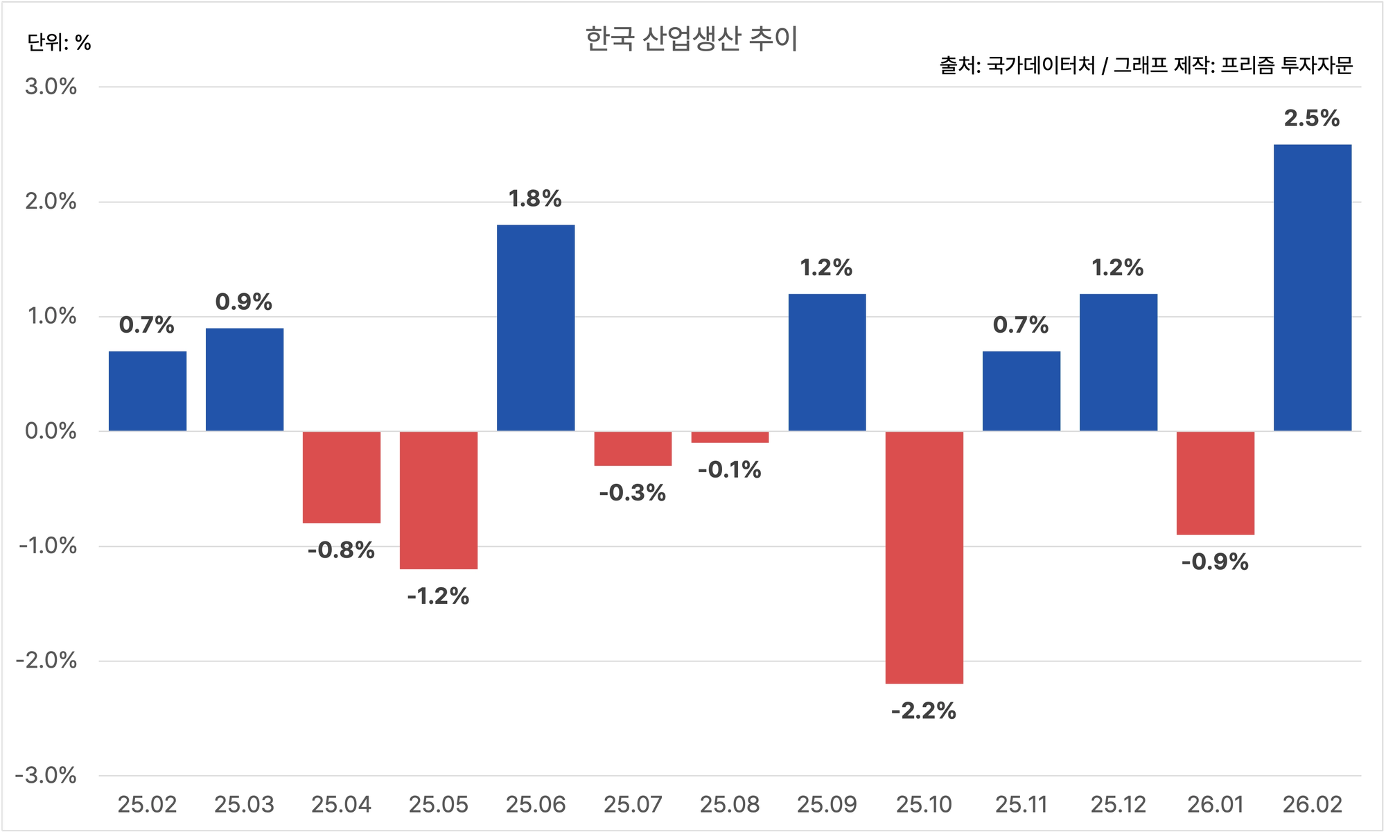 한국의 2월 산업생산은 MoM 2.5%에요.